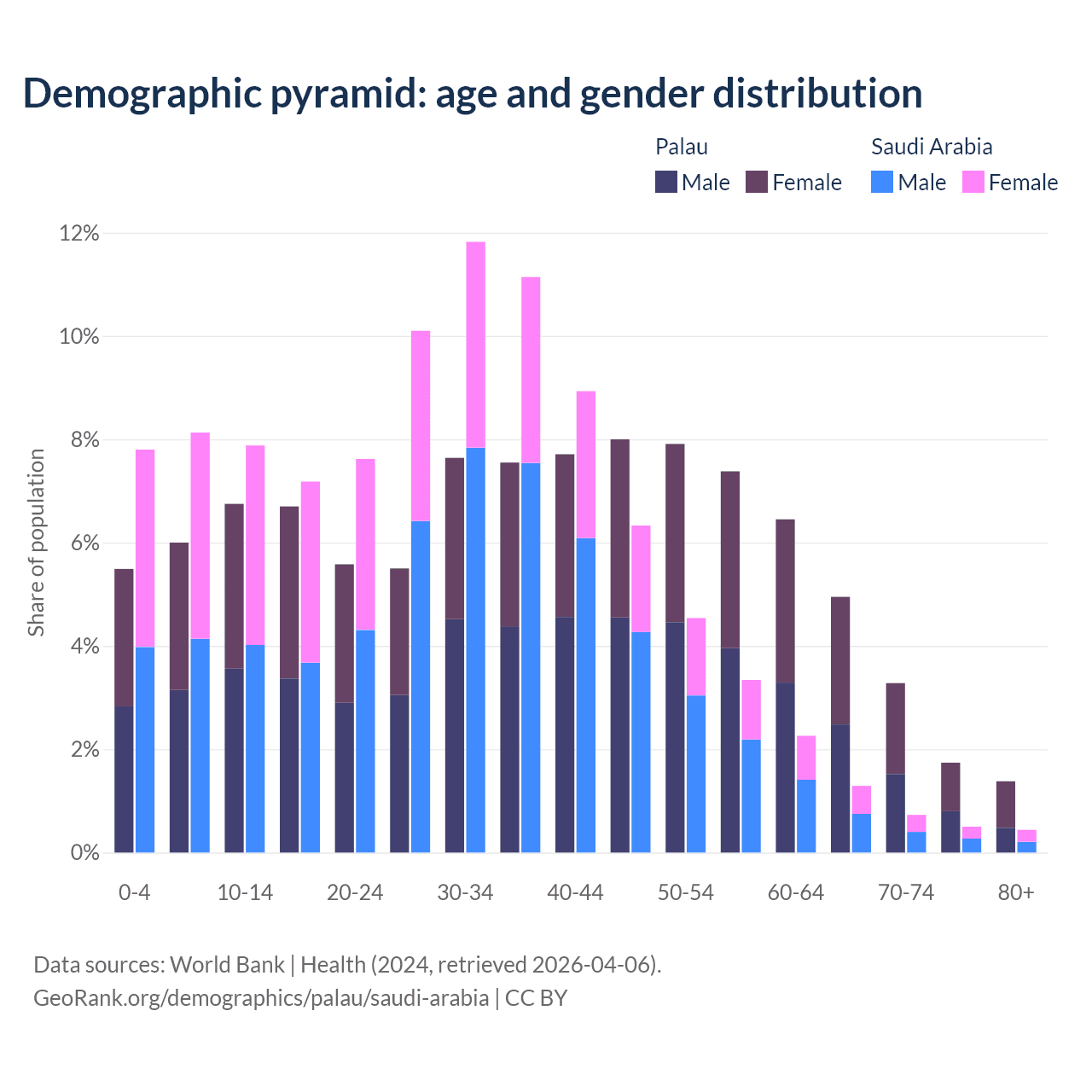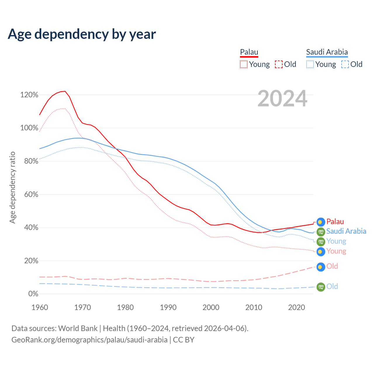 - Palau is ranked 53/196 by median age (oldest to youngest) vs 98/196 for Saudi Arabia.
