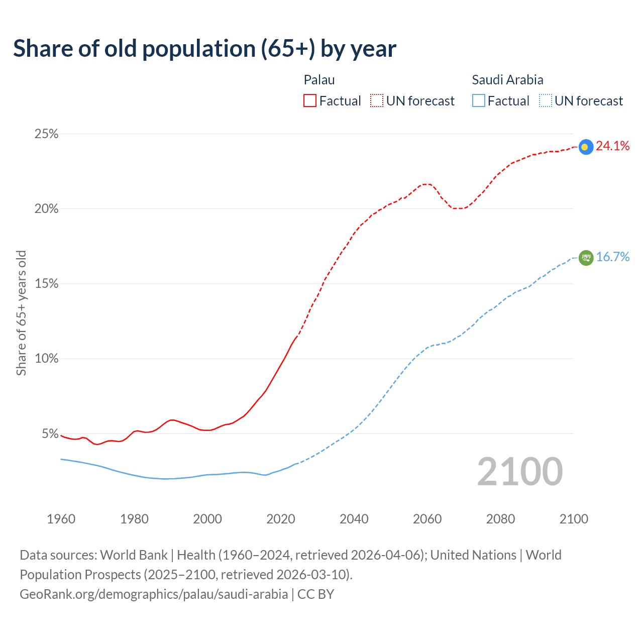 The share of older people aged 65 and over is 11.3% in Palau and 2.95% in Saudi Arabia. Life expectancy in Palau compared to Saudi Arabia .