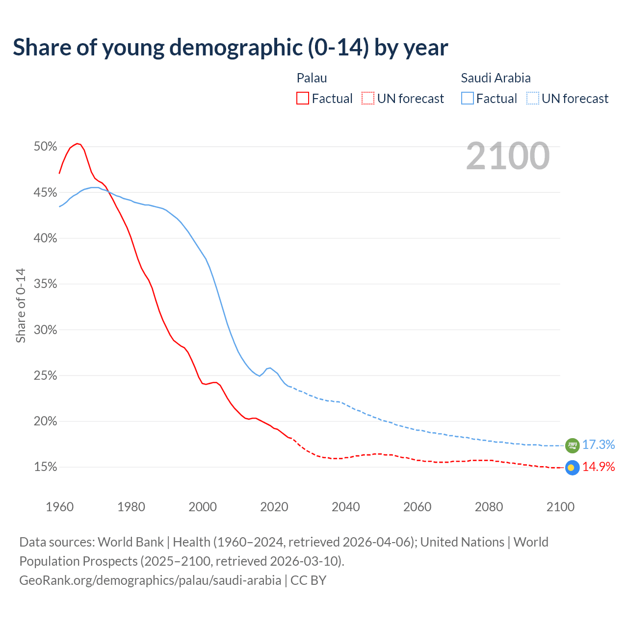 - The share of young demographic (0-15 years old) in Palau is 18.2% vs 23.8% in Saudi Arabia.