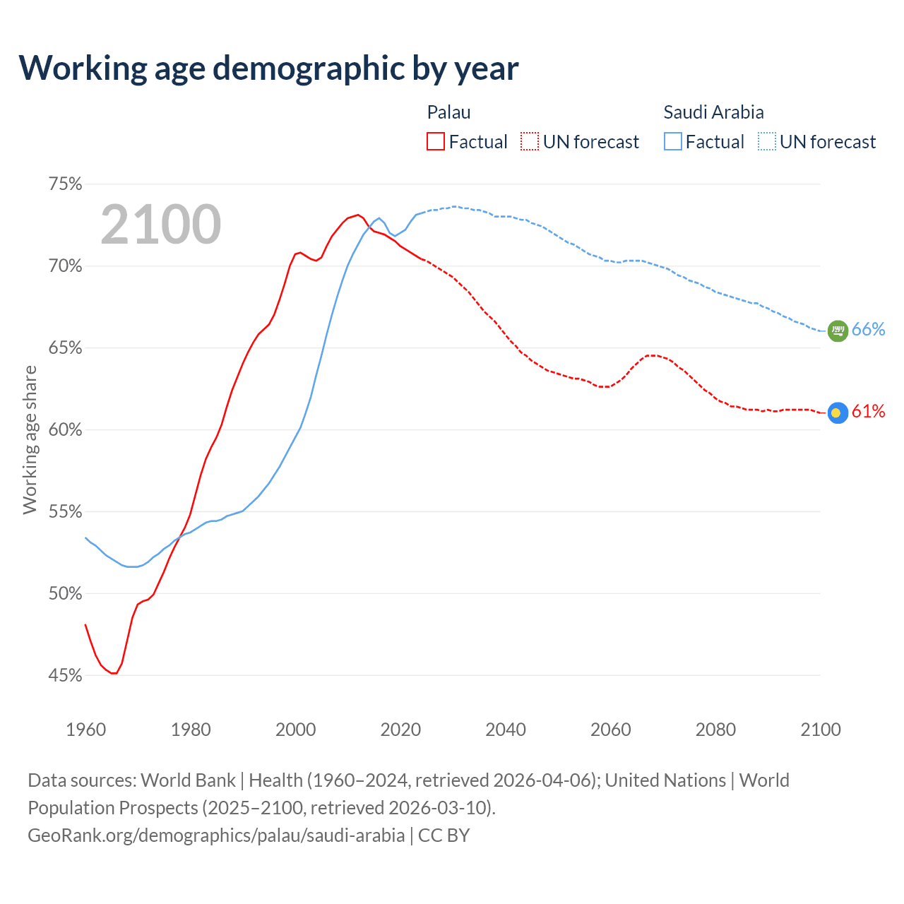 - Palau has 12.4K working age adults (aged 15-64) vs 26.9M in Saudi Arabia.