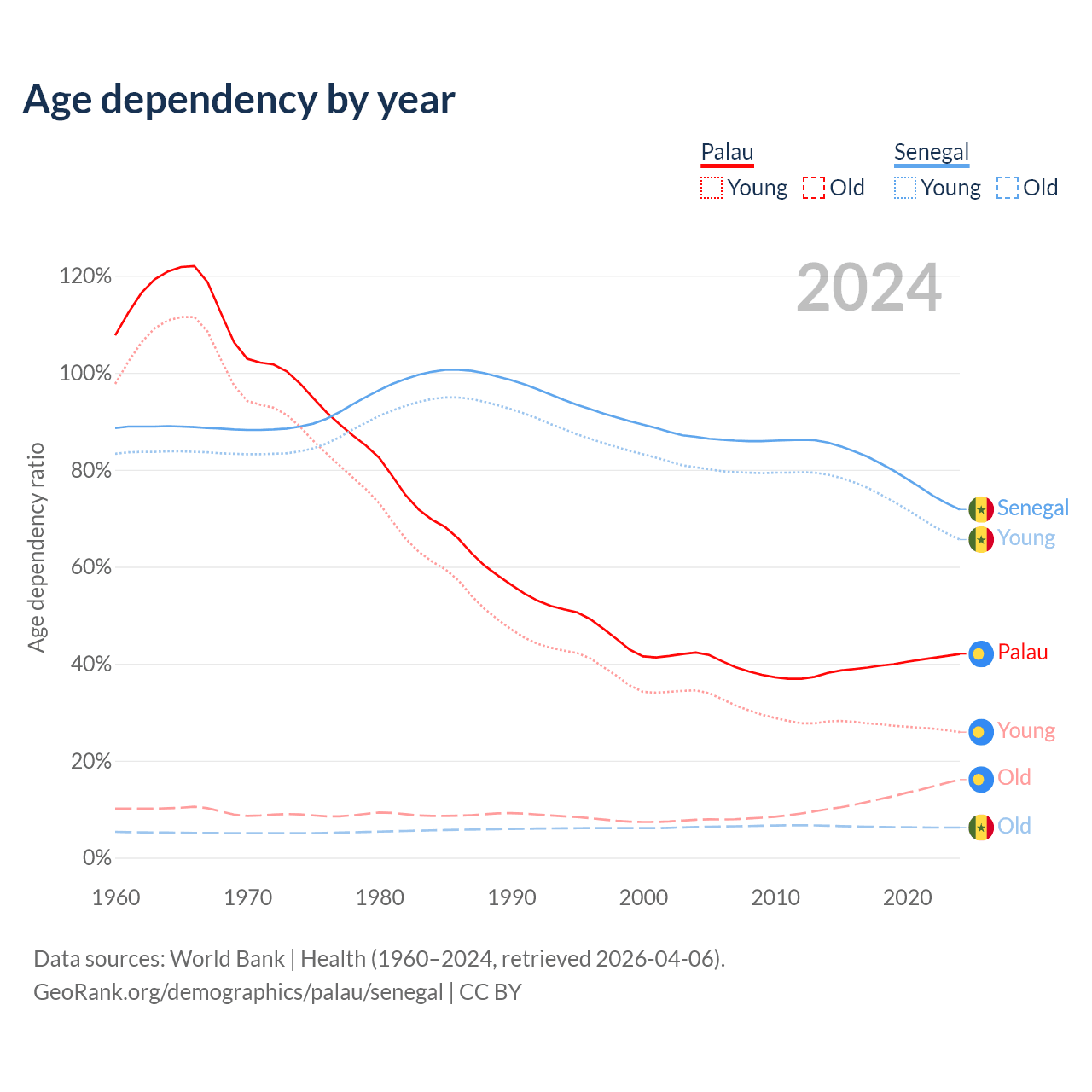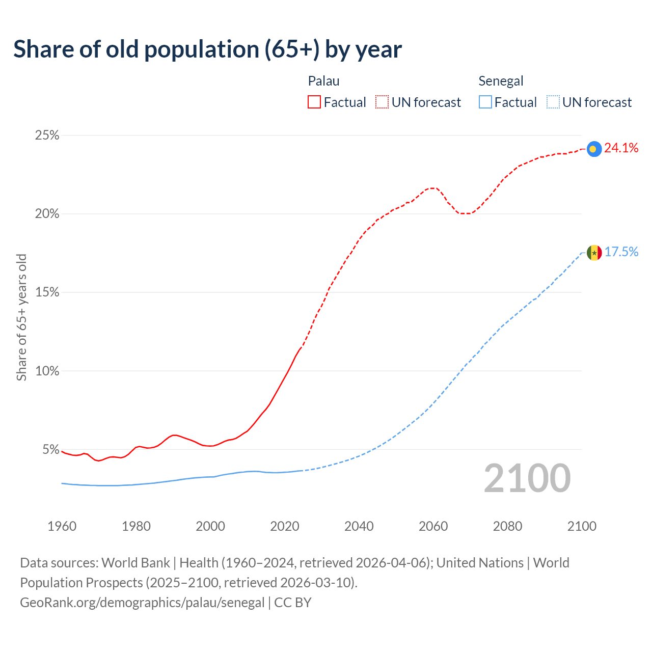 - The share of old-age demographic (65+) in Palau is 11.3% vs 3.62% in Senegal.