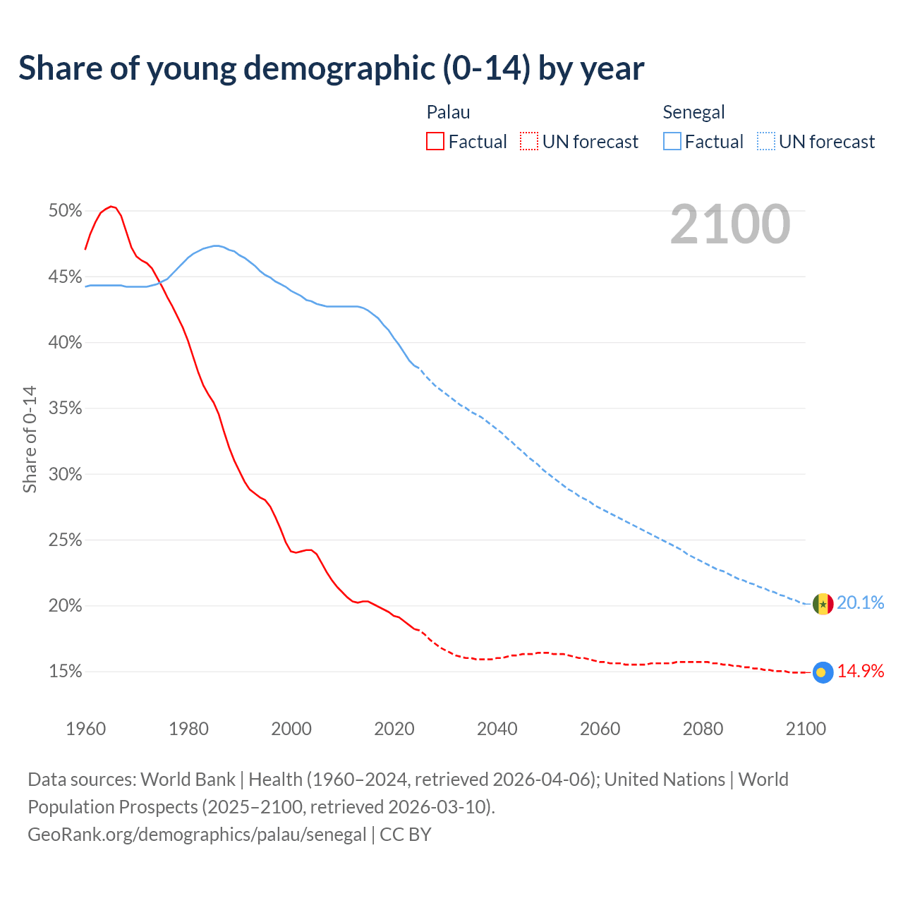 - The share of young demographic (0-15 years old) in Palau is 18.2% vs 38.2% in Senegal.