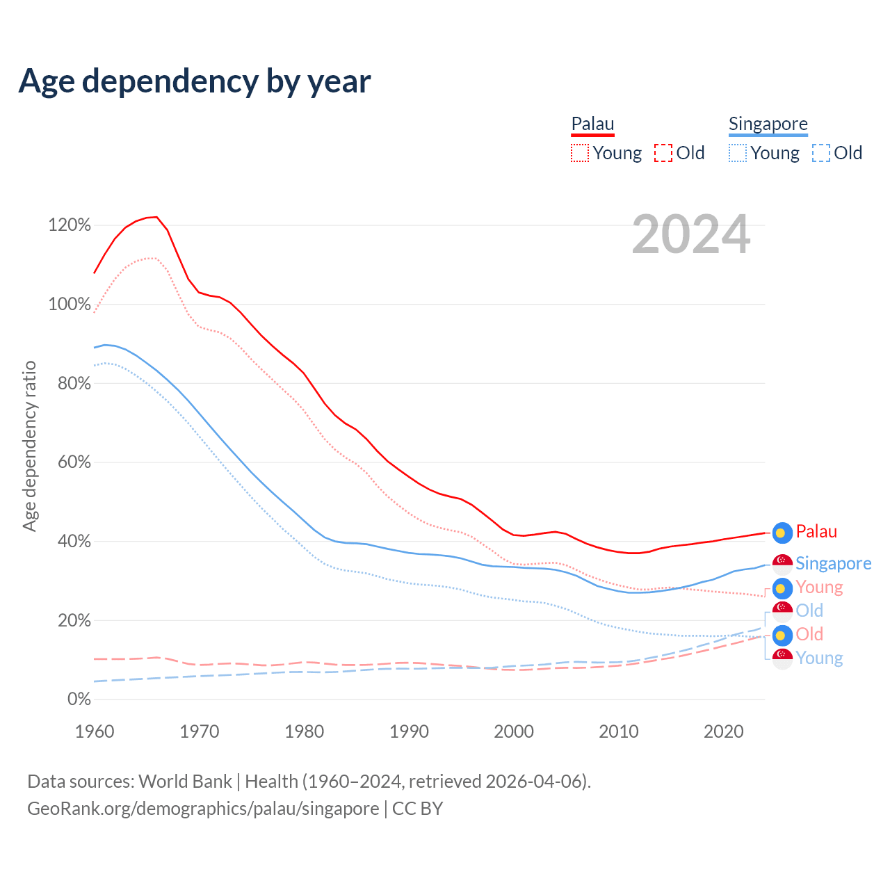 The share of older people aged 65 and over is 11.3% in Palau and 13.7% in Singapore. Life expectancy in Palau compared to Singapore .