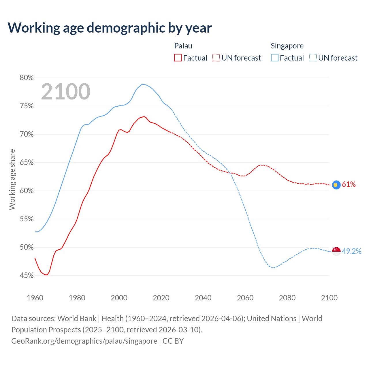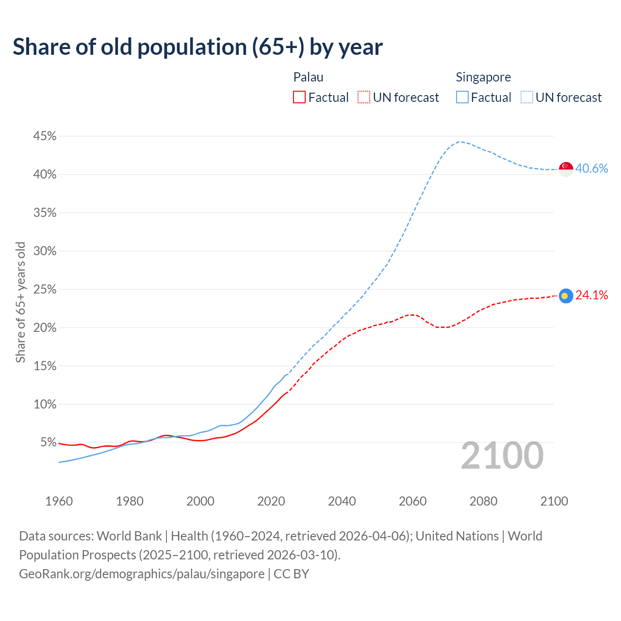 Median age Palau vs Singapore, 1960-2100
