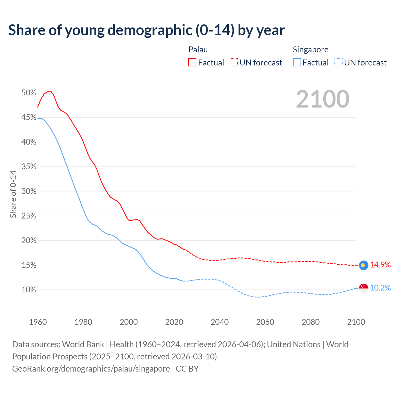- The share of young demographic (0-15 years old) in Palau is 18.2% vs 11.7% in Singapore.