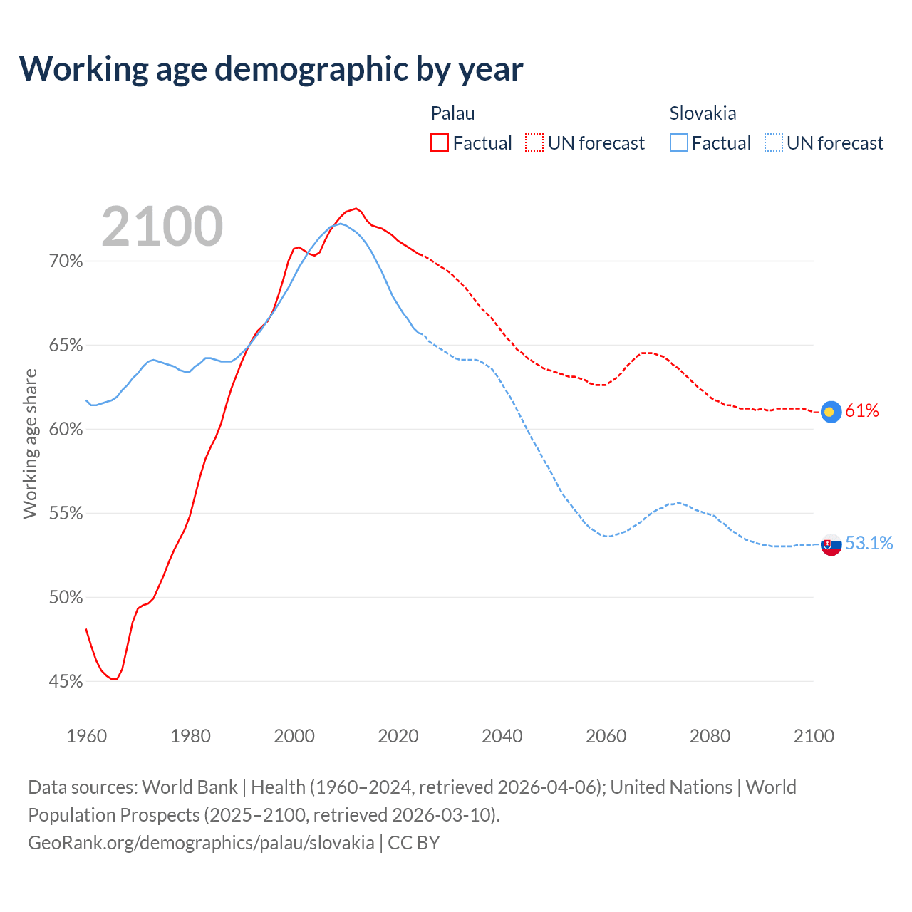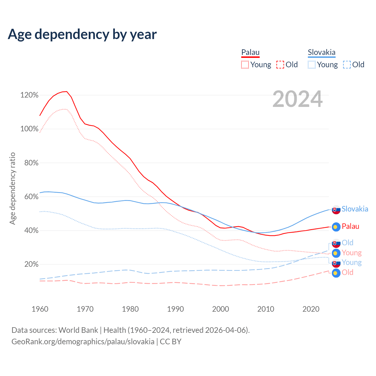 - The share of young demographic (0-15 years old) in Palau is 18.2% vs 15.8% in Slovakia.