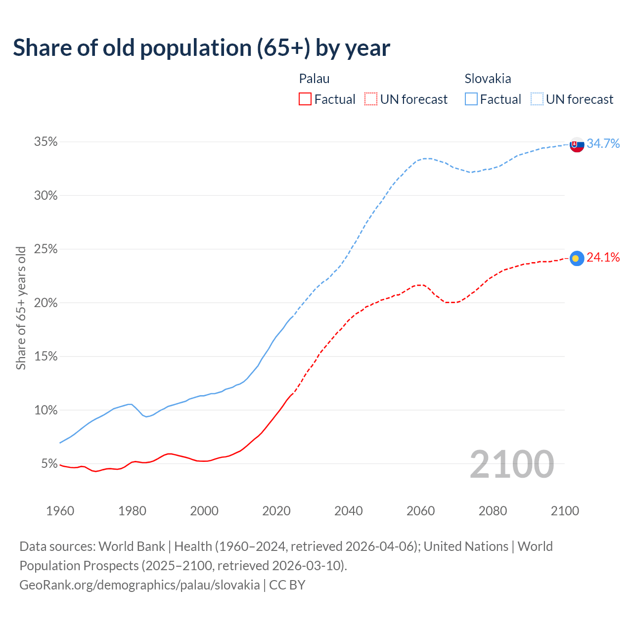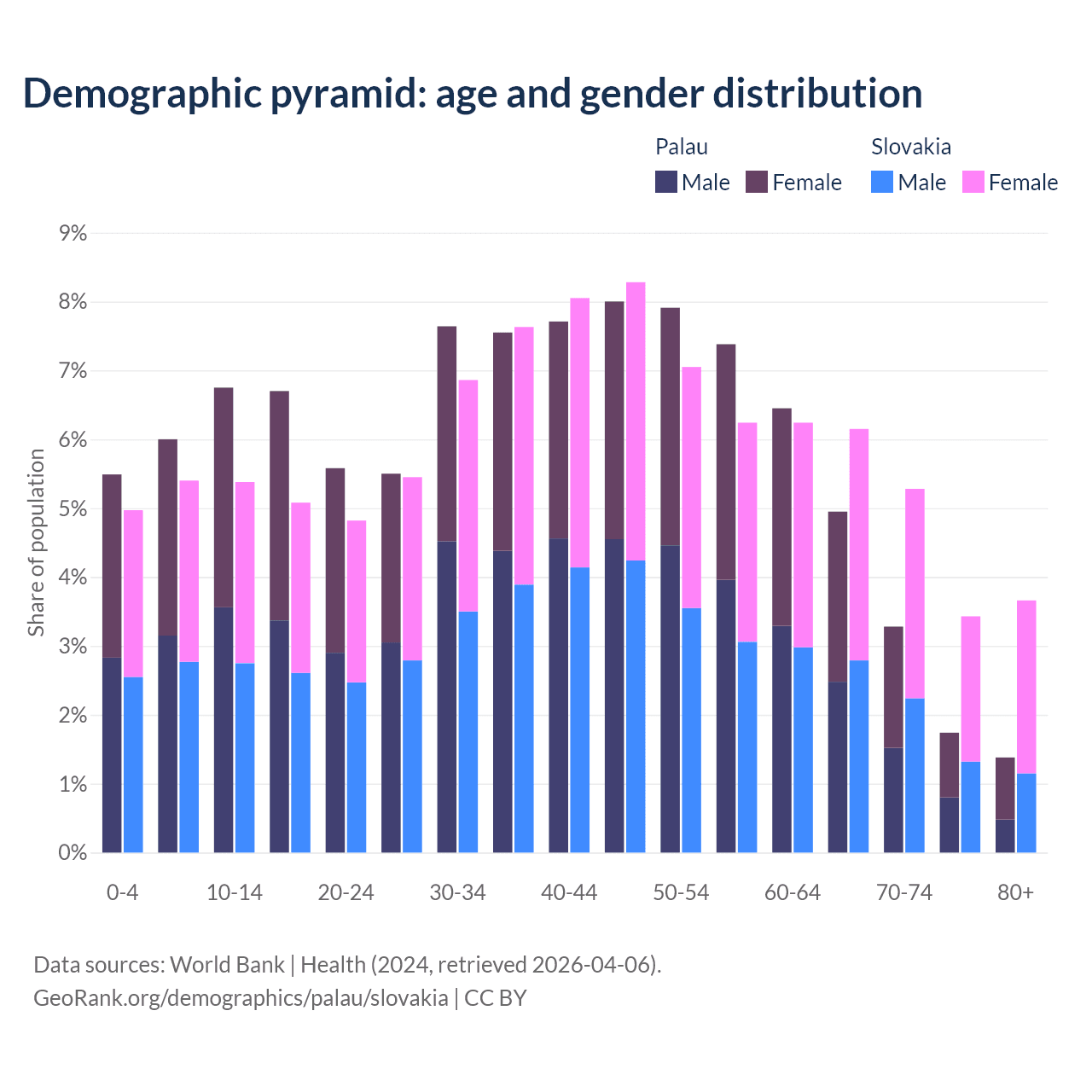 - The share of old-age demographic (65+) in Palau is 11.3% vs 18.5% in Slovakia.