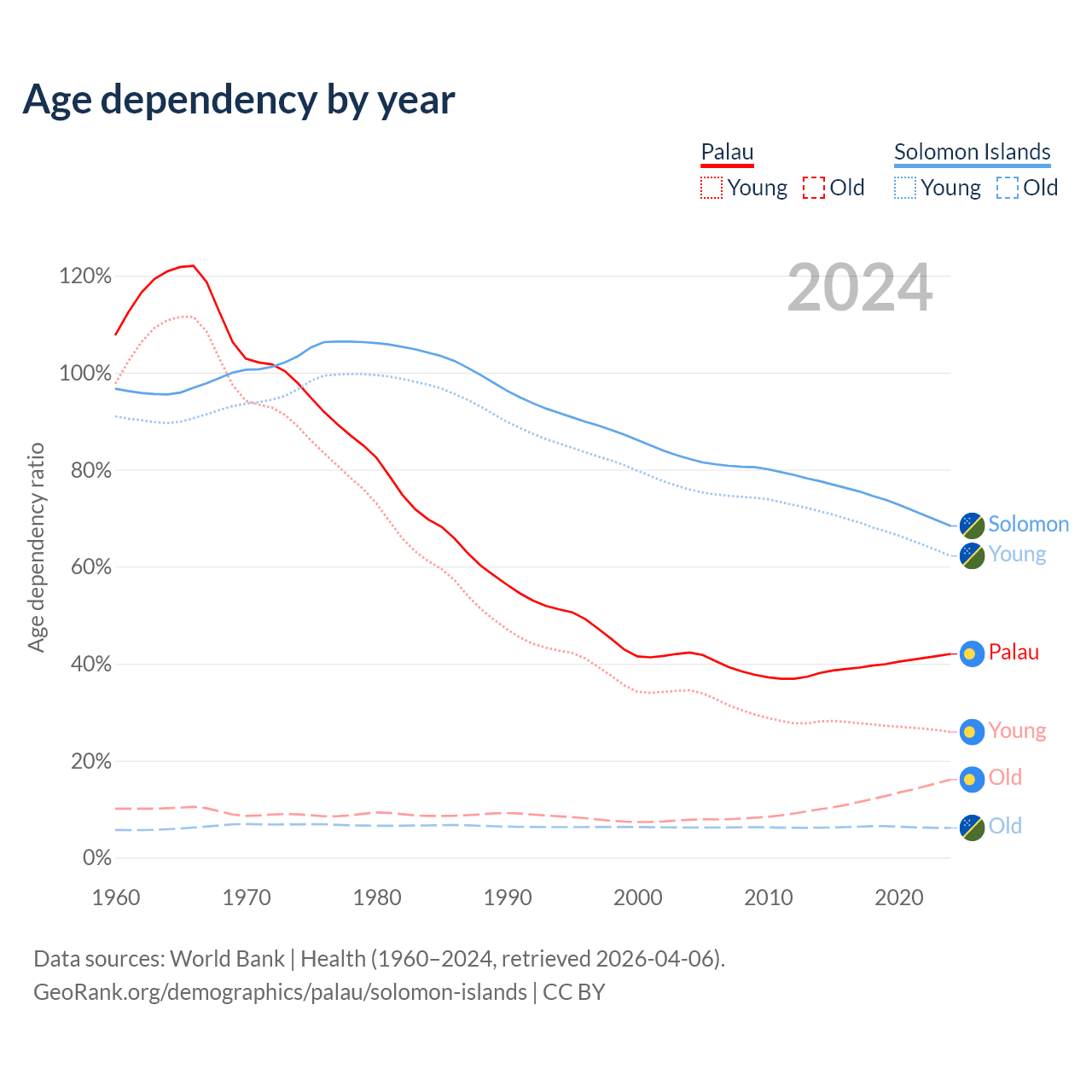 - Palau is ranked 53/196 by median age (oldest to youngest) vs 153/196 for the Solomon Islands.