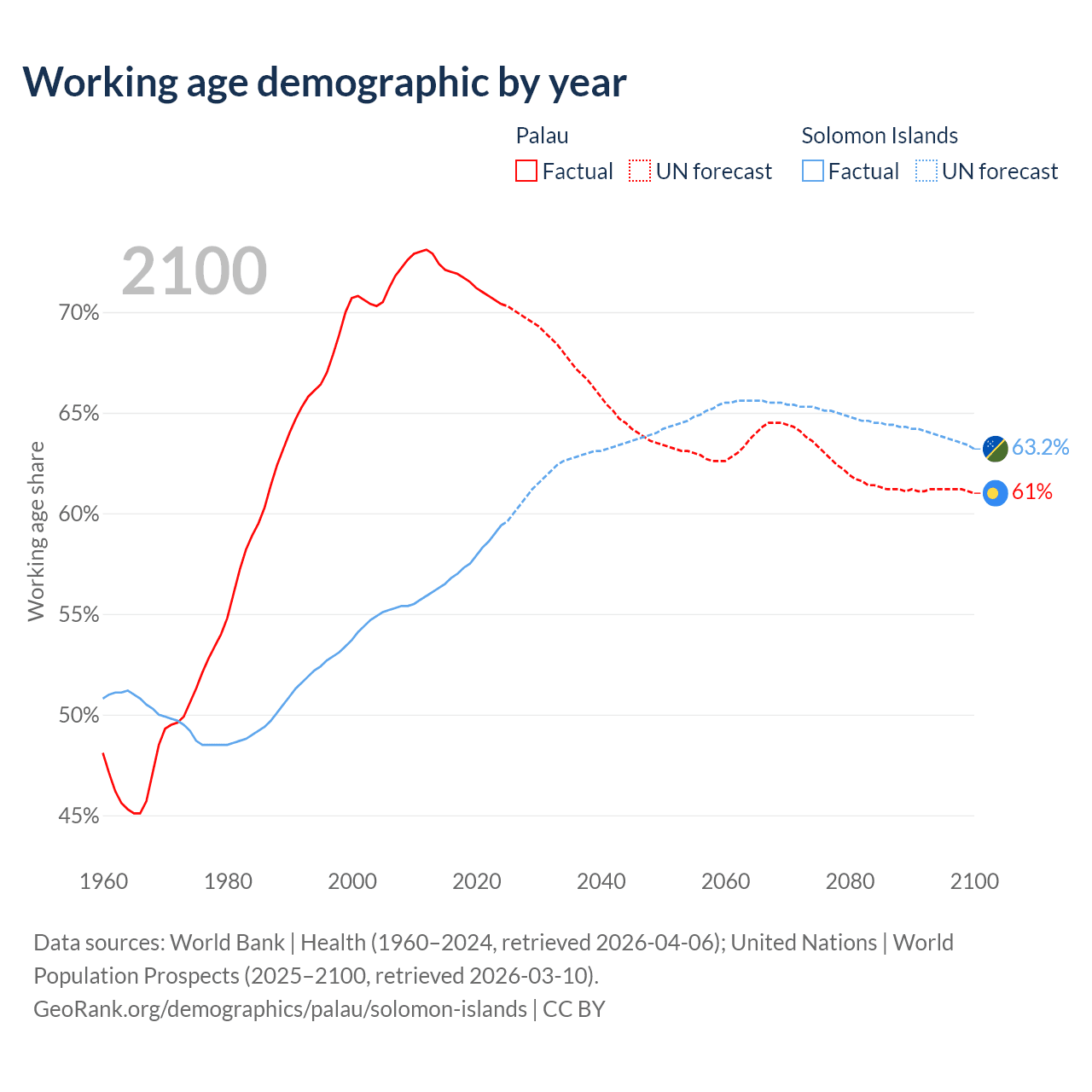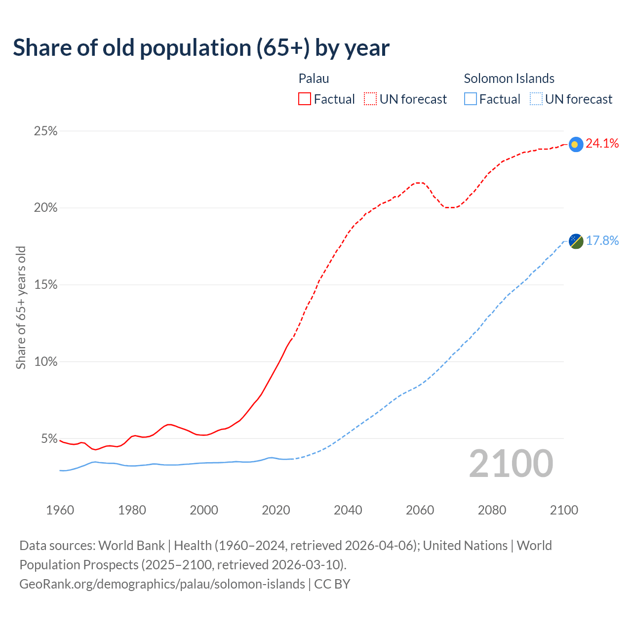 The share of older people aged 65 and over is 11.3% in Palau and 3.64% in the Solomon Islands. Life expectancy in Palau compared to the Solomon Islands .