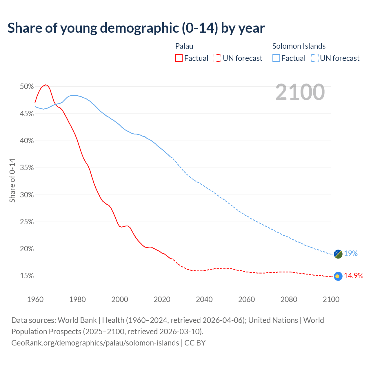 Median age Palau vs Solomon Islands, 1960-2100