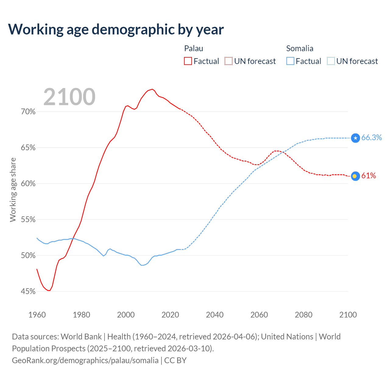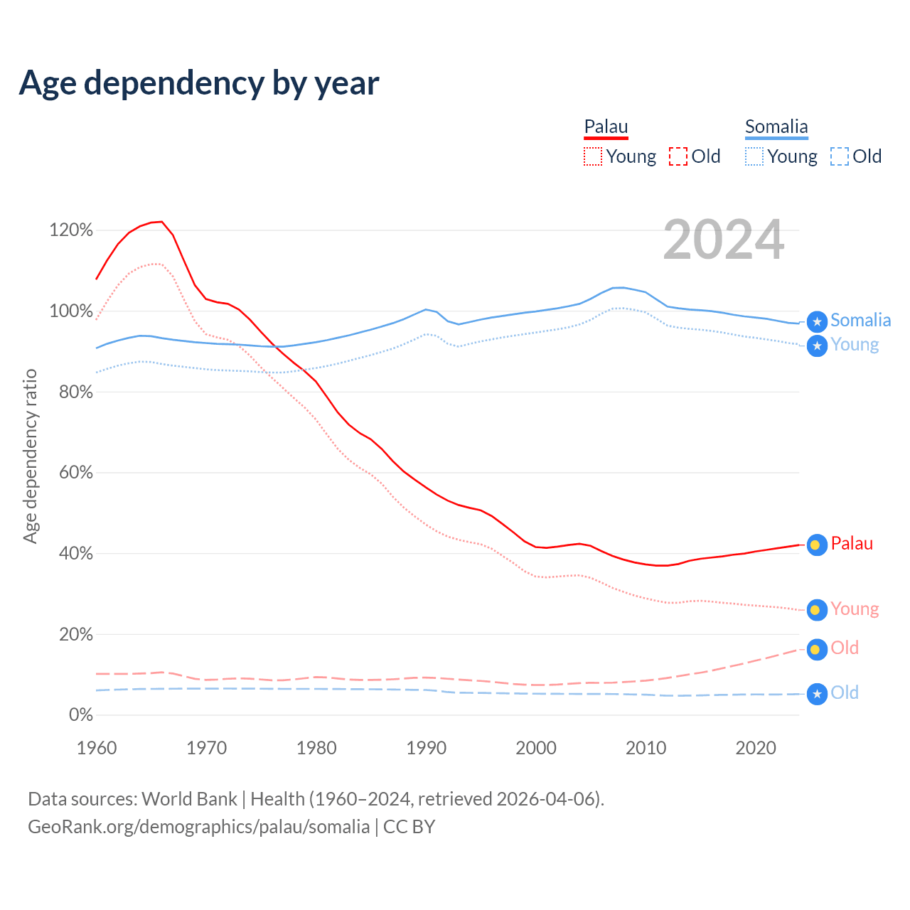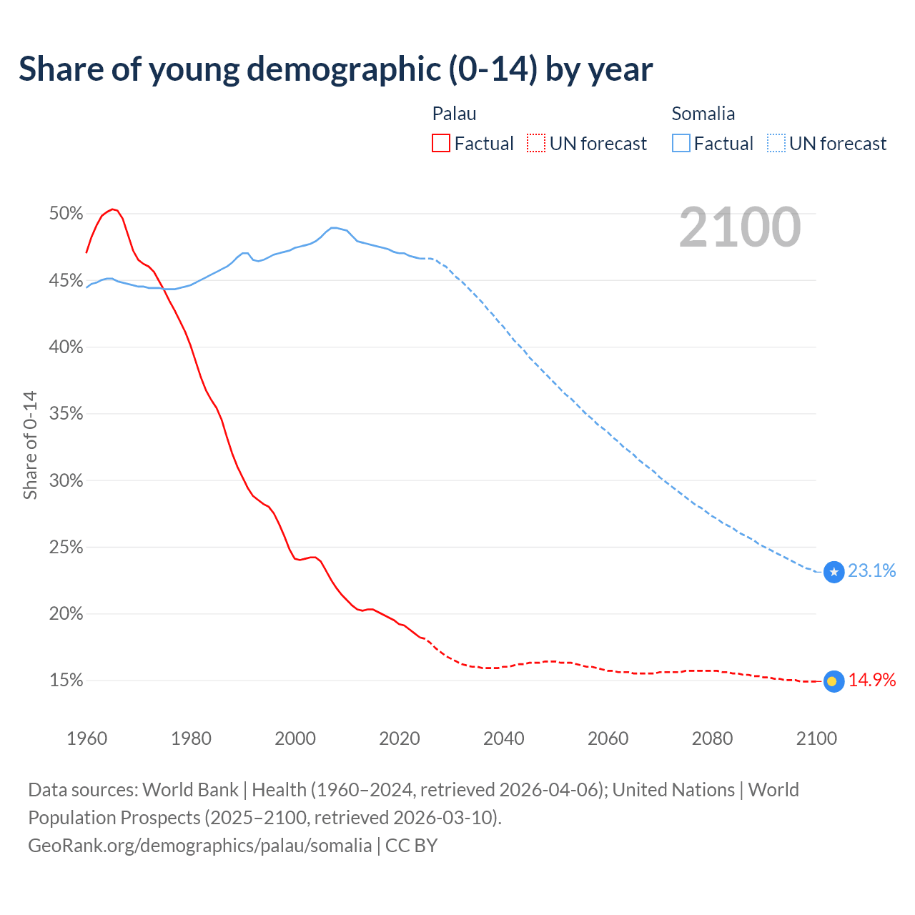 - The share of young demographic (0-15 years old) in Palau is 18.2% vs 46.6% in Somalia.