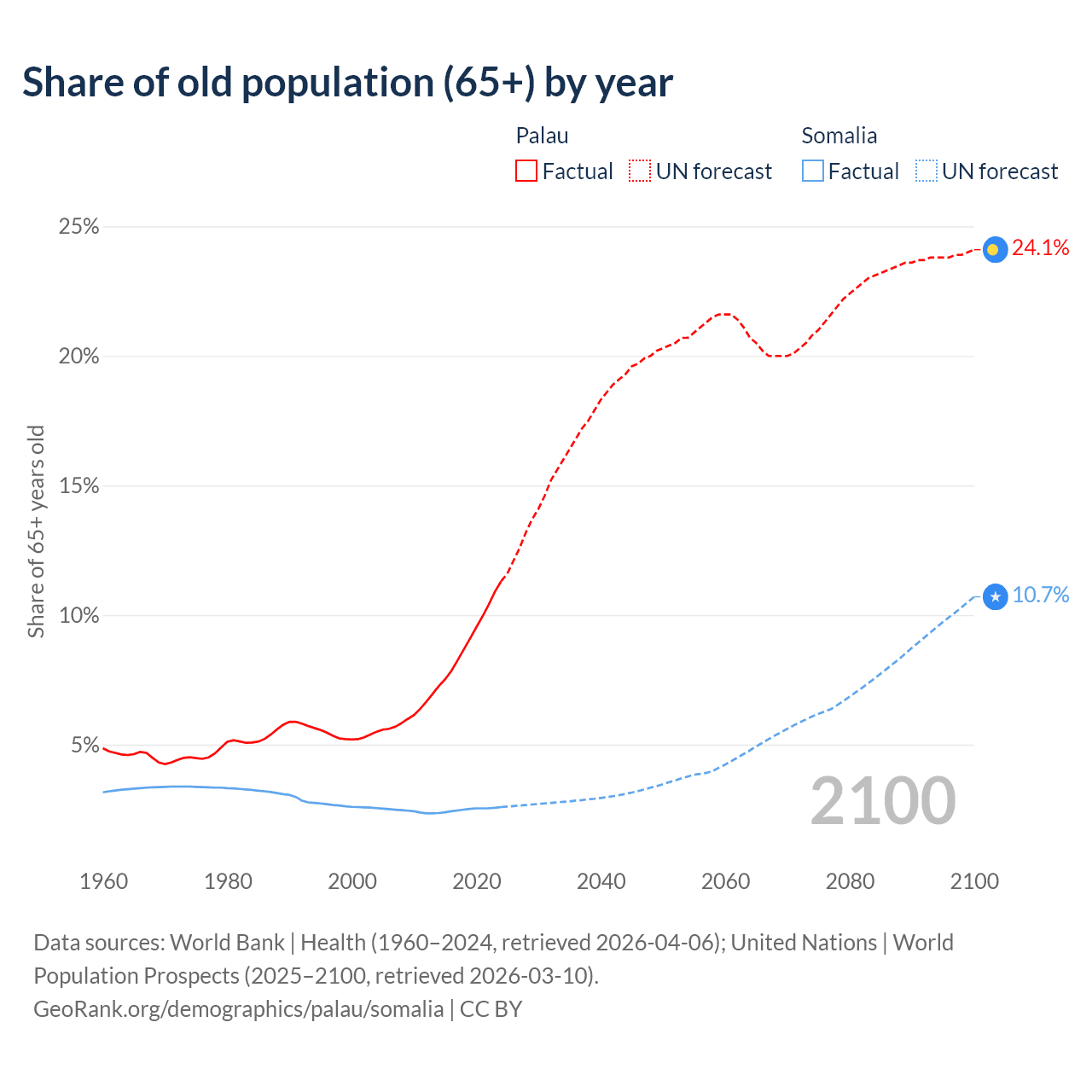 - The share of old-age demographic (65+) in Palau is 11.3% vs 2.59% in Somalia.