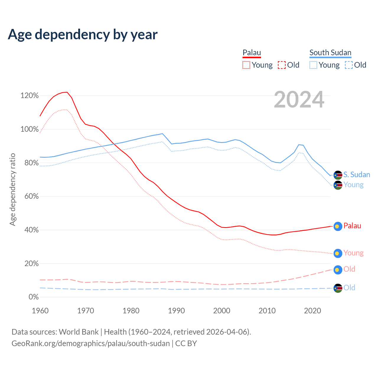 - Palau is ranked 53/196 by median age (oldest to youngest) vs 173/196 for South Sudan.