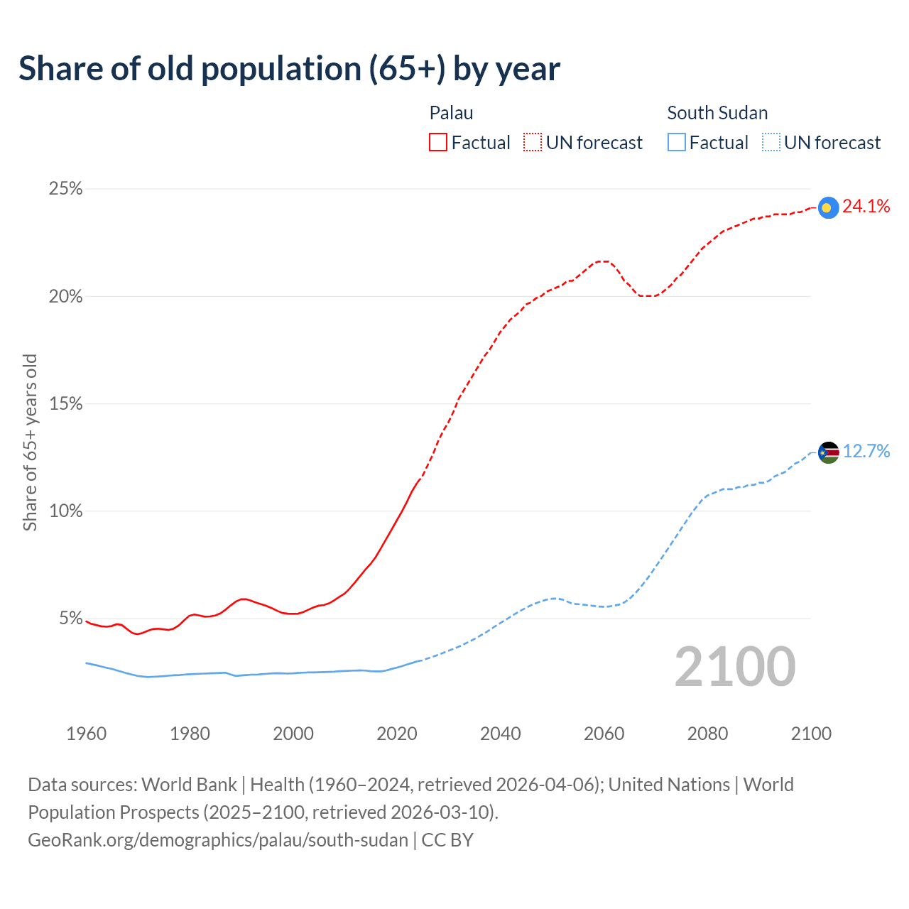The share of older people aged 65 and over is 11.3% in Palau and 2.99% in South Sudan. Life expectancy in Palau compared to South Sudan .