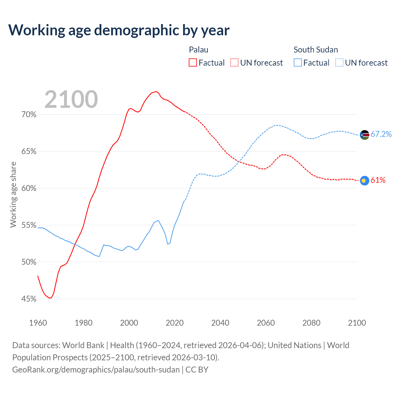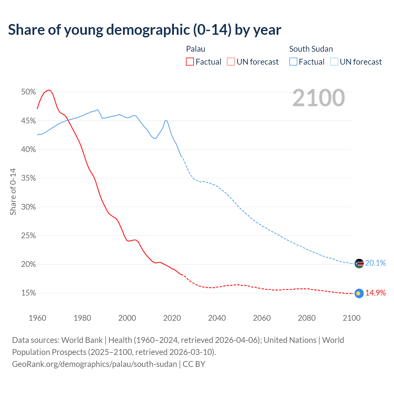 - The share of young demographic (0-15 years old) in Palau is 18.2% vs 38.9% in South Sudan.