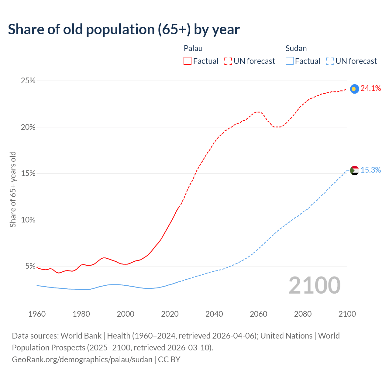 - The share of old-age demographic (65+) in Palau is 11.3% vs 3.3% in Sudan.