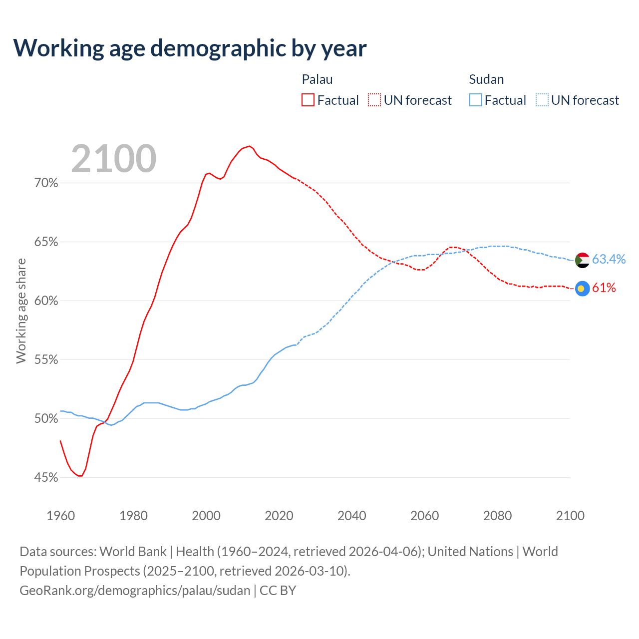 - The share of young demographic (0-15 years old) in Palau is 18.2% vs 40.5% in Sudan.