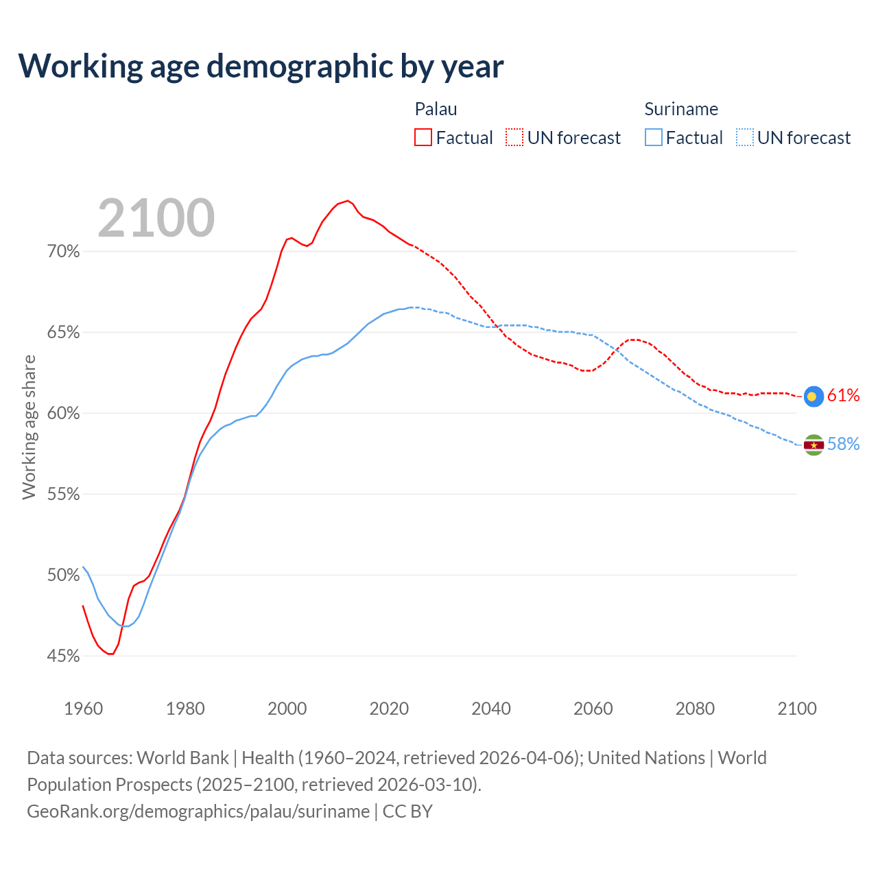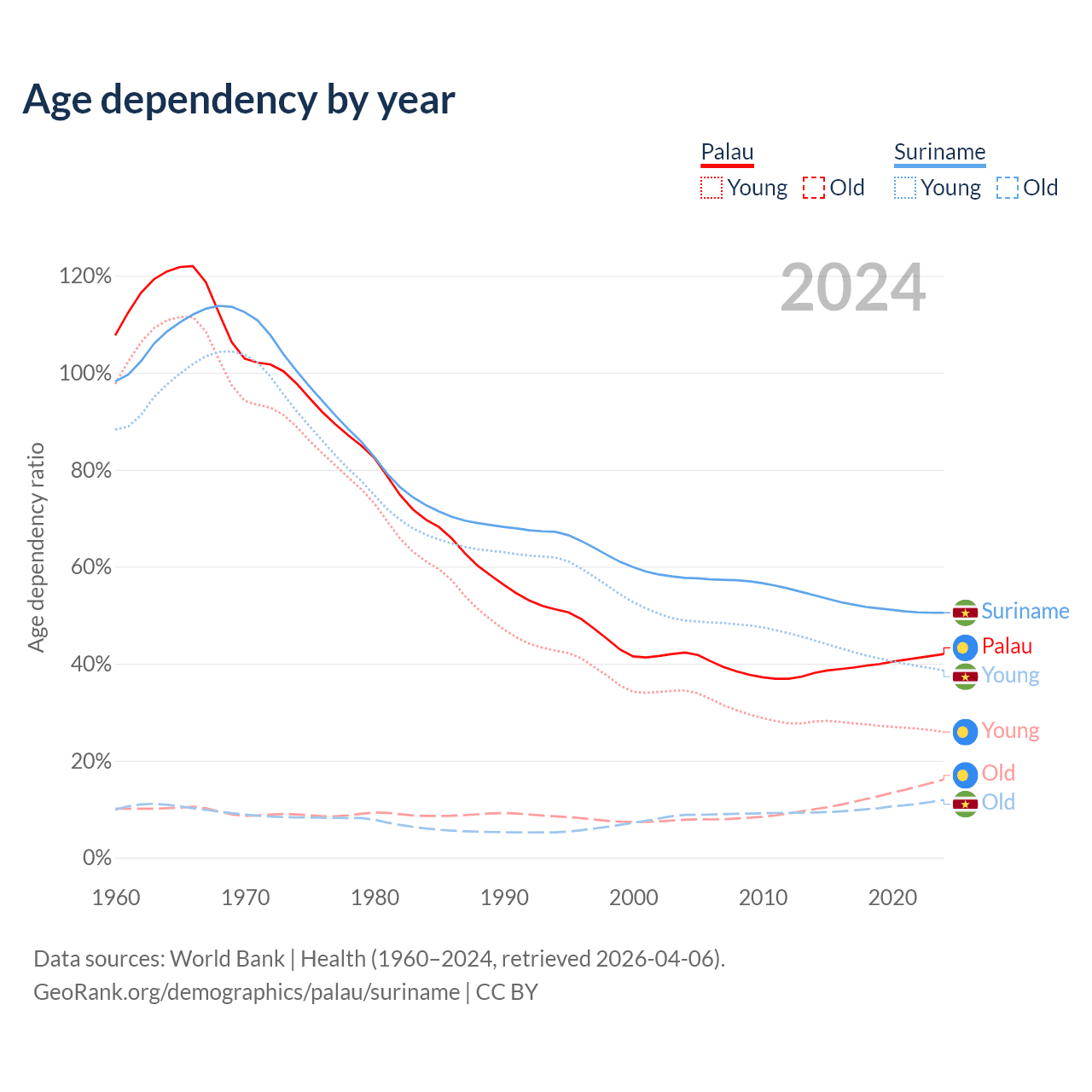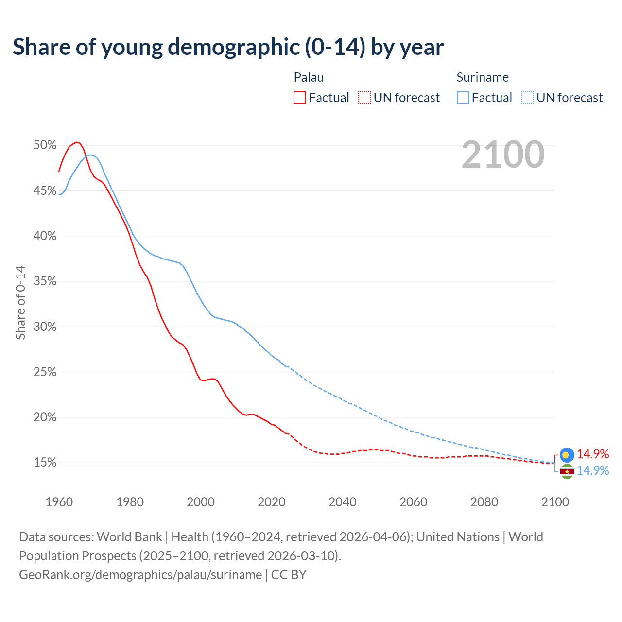 - The share of young demographic (0-15 years old) in Palau is 18.2% vs 25.6% in Suriname.