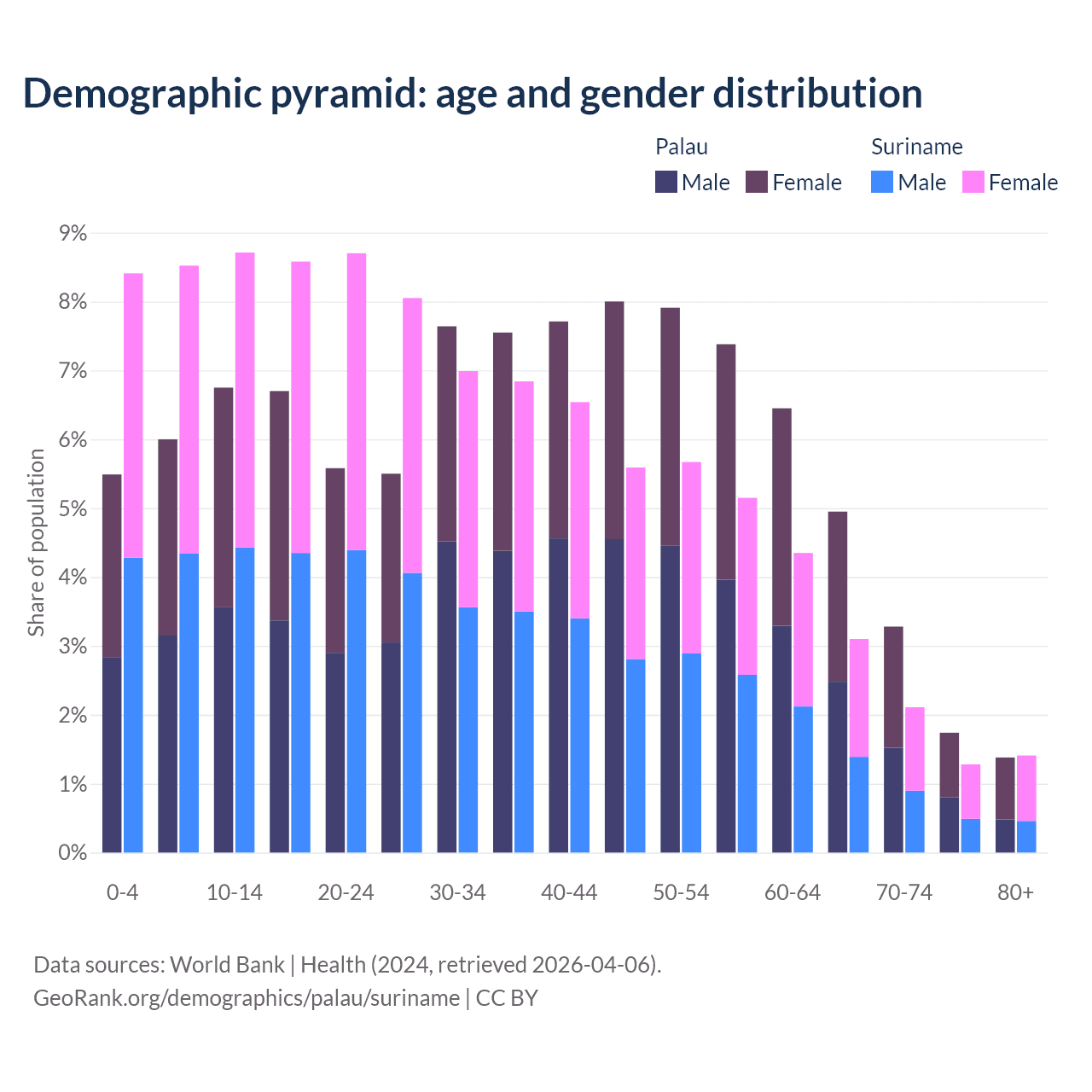 - The share of old-age demographic (65+) in Palau is 11.3% vs 7.9% in Suriname.