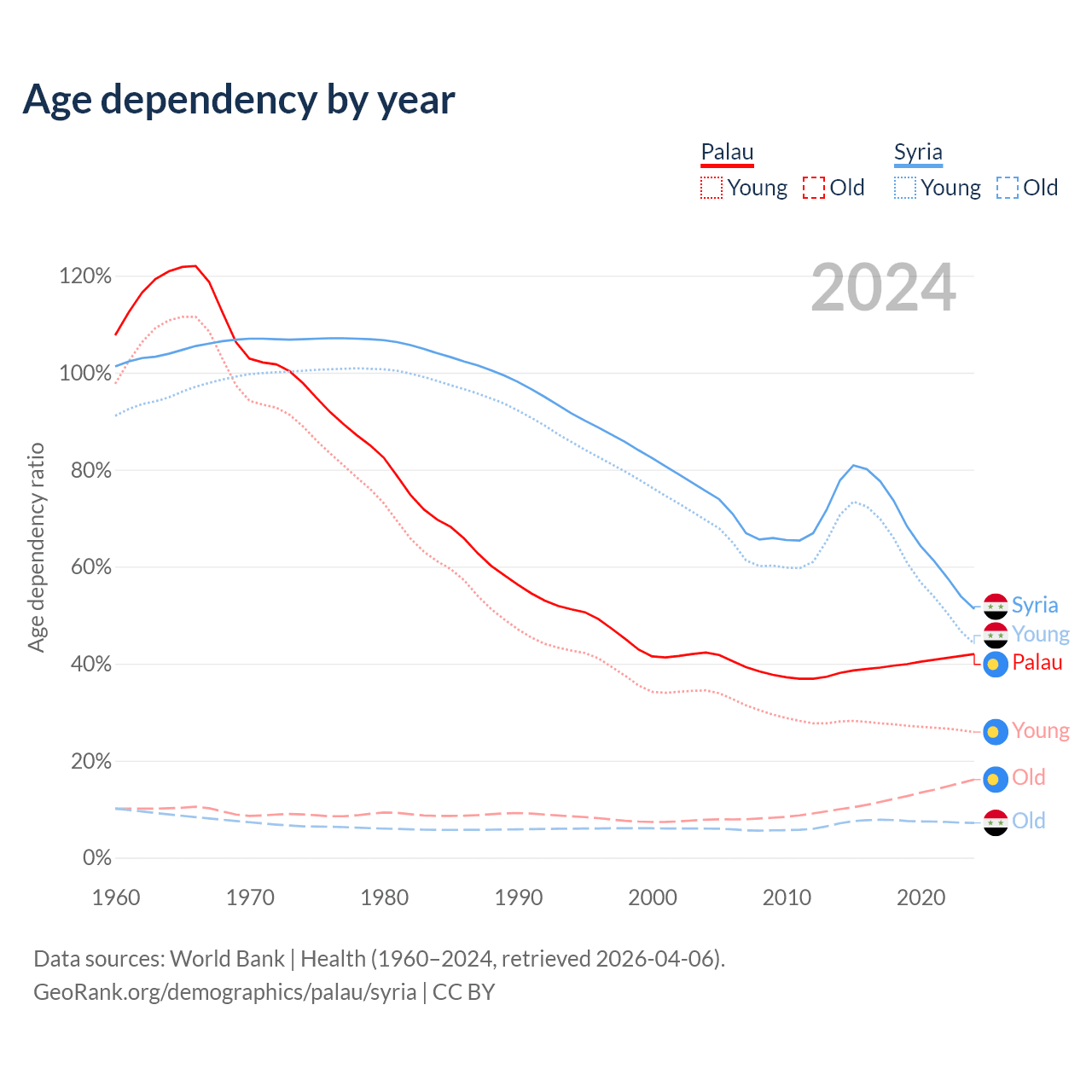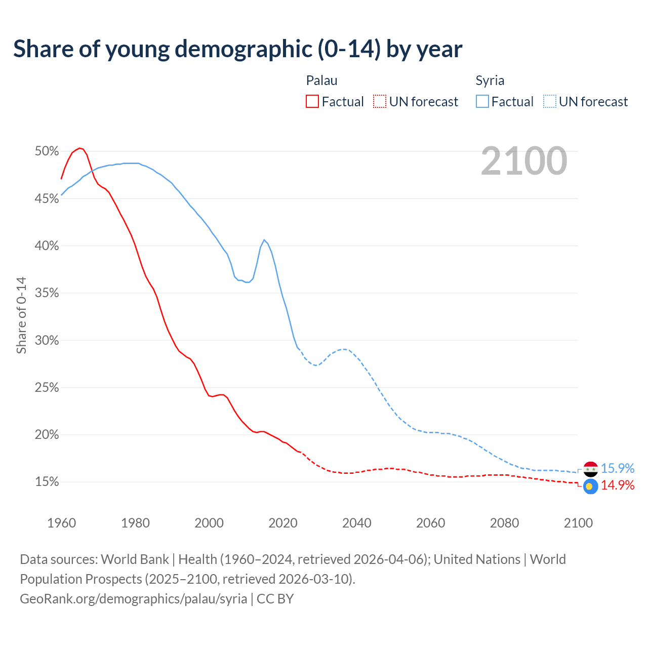 - The share of young demographic (0-15 years old) in Palau is 18.2% vs 29.2% in Syria.