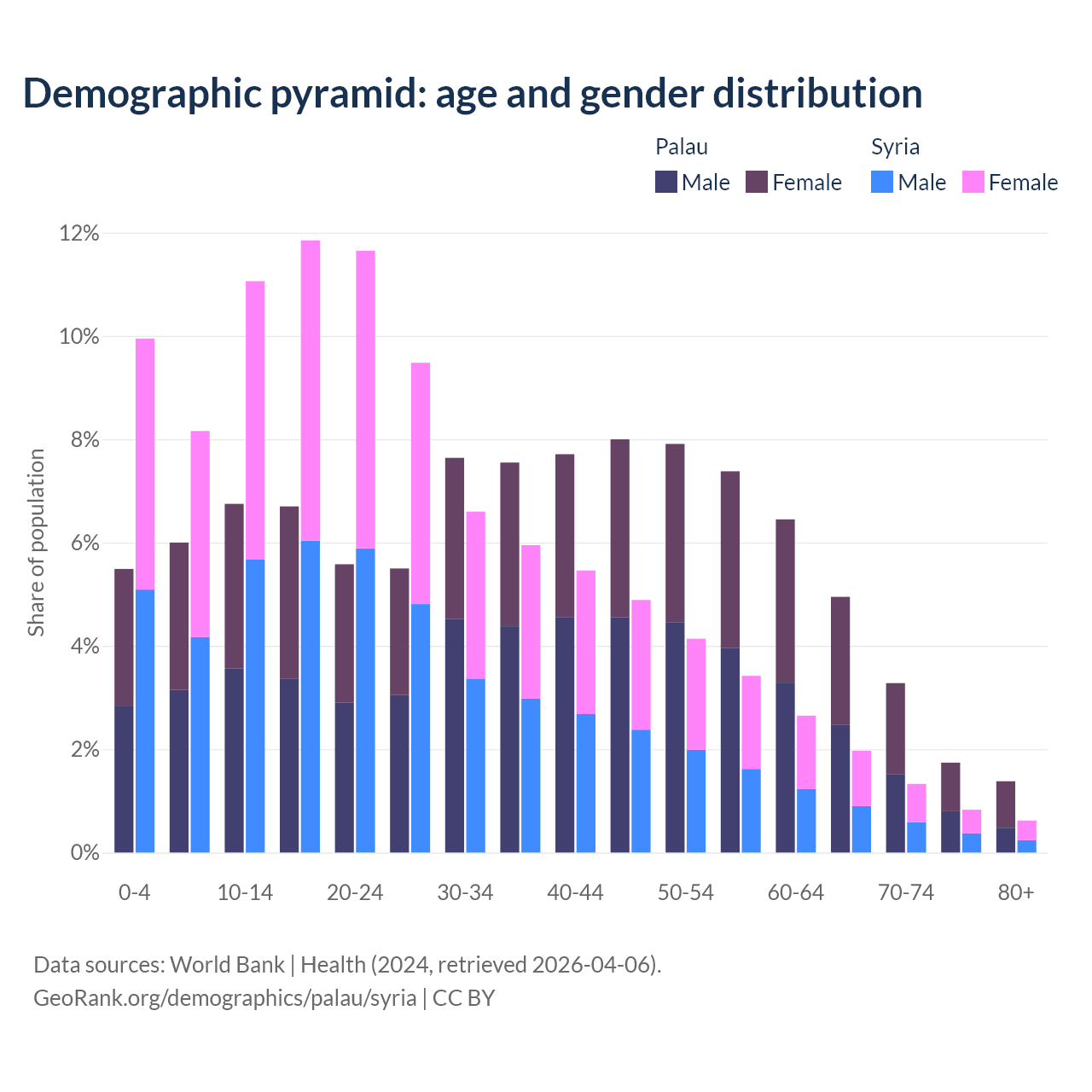 - Palau is ranked 53/196 by median age (oldest to youngest) vs 138/196 for Syria.