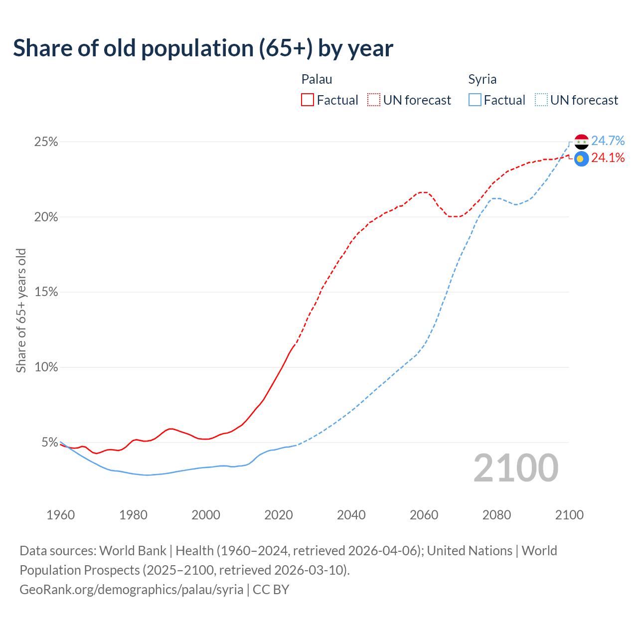 - The share of old-age demographic (65+) in Palau is 11.3% vs 4.74% in Syria.