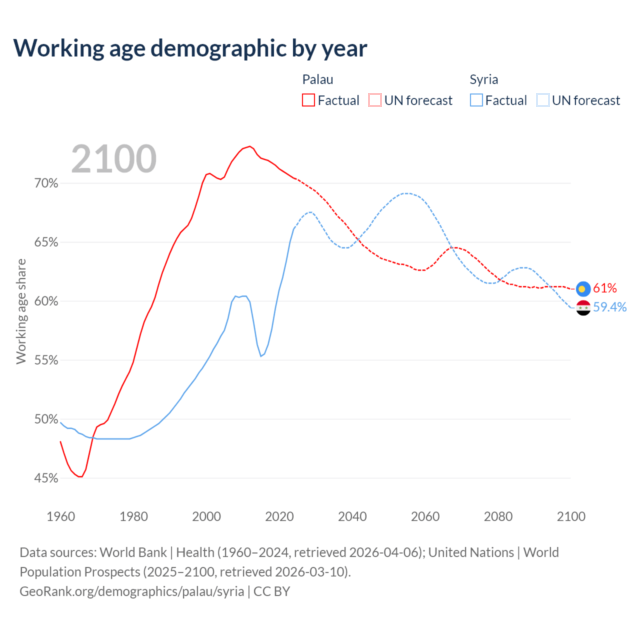 - Palau has 12.4K working age adults (aged 15-64) vs 17.7M in Syria.