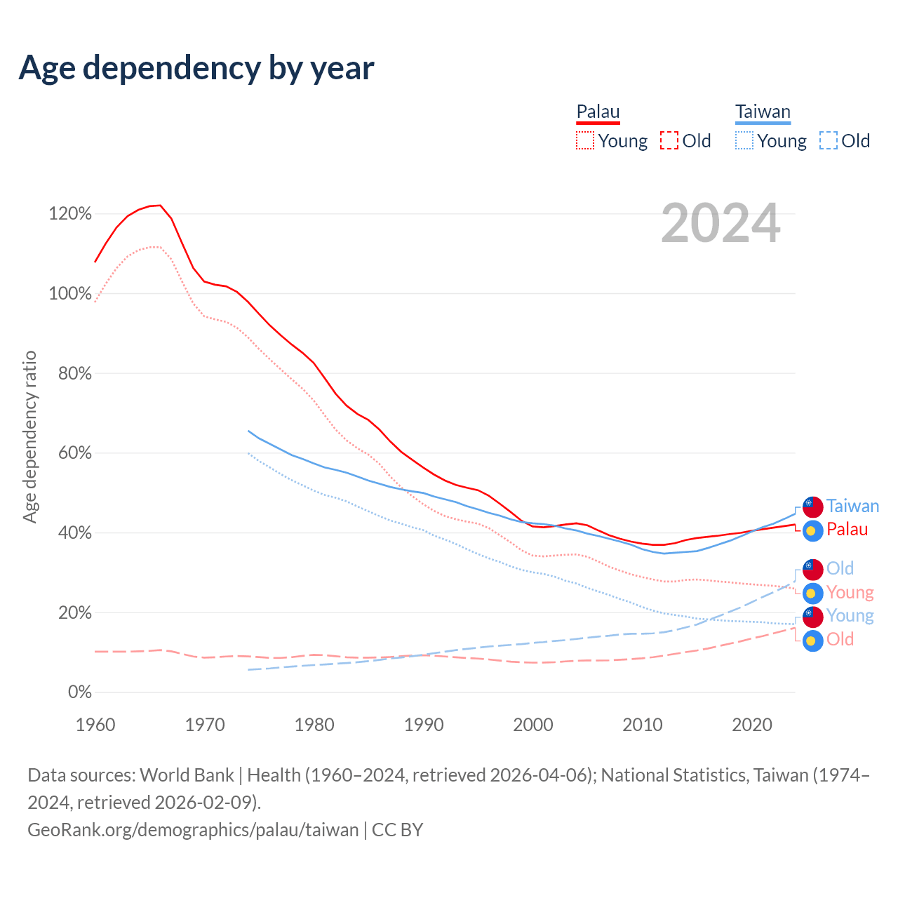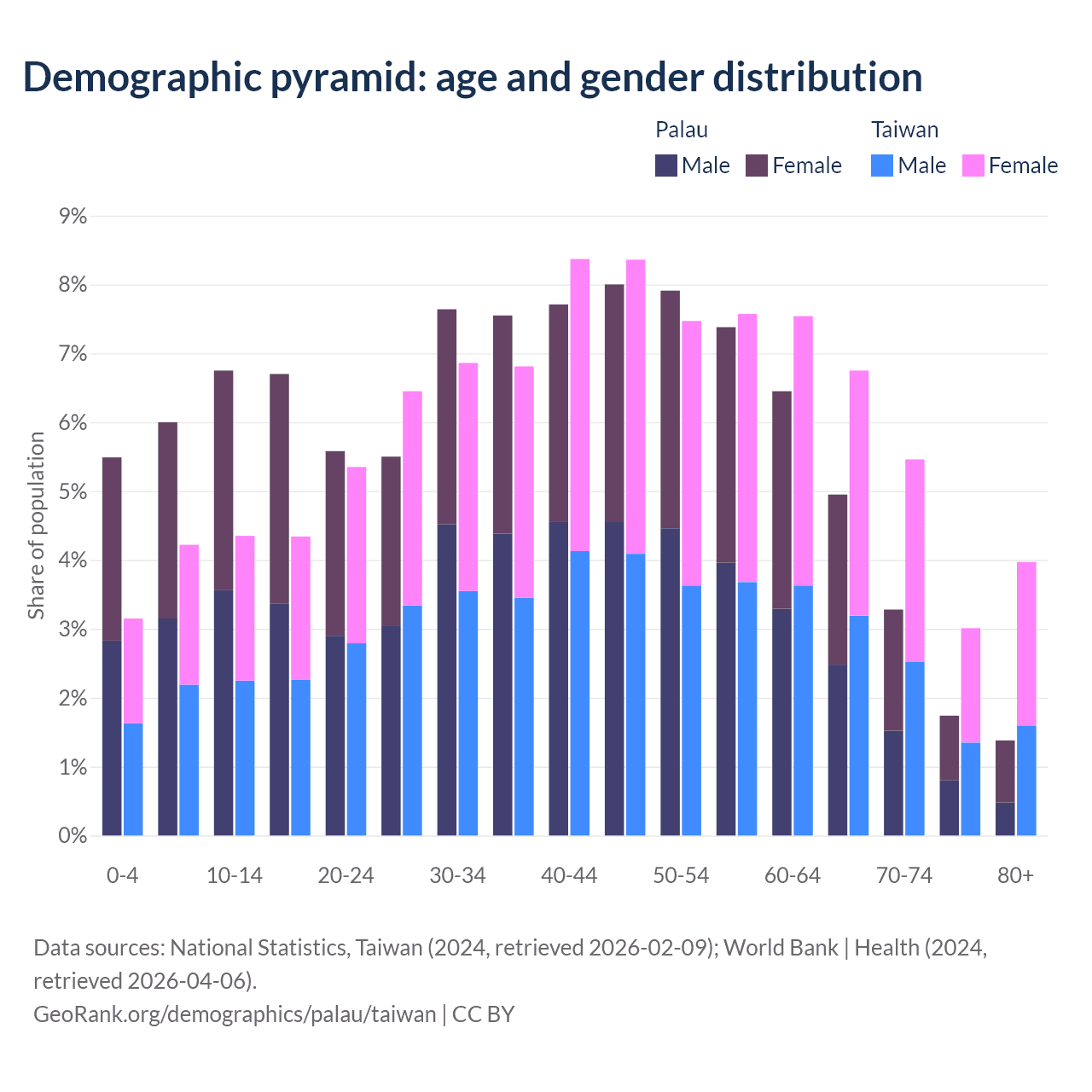 - Palau is ranked 53/196 by median age (oldest to youngest) vs 16/196 for Taiwan.
