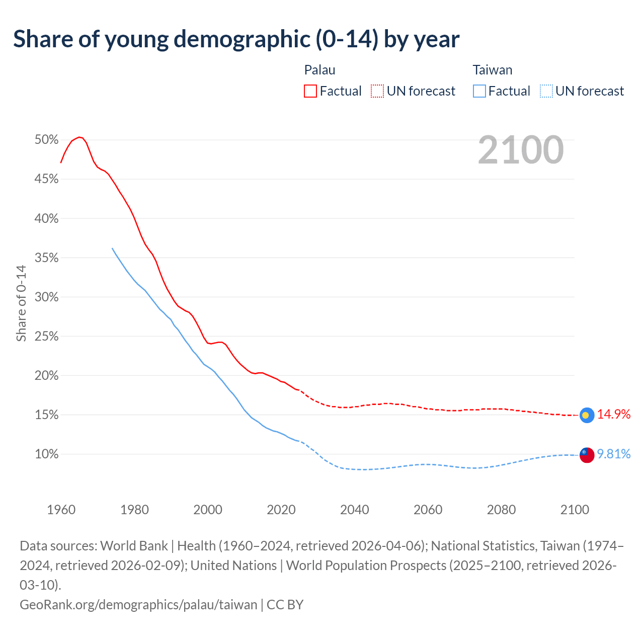 - The share of young demographic (0-15 years old) in Palau is 18.2% vs 11.7% in Taiwan.