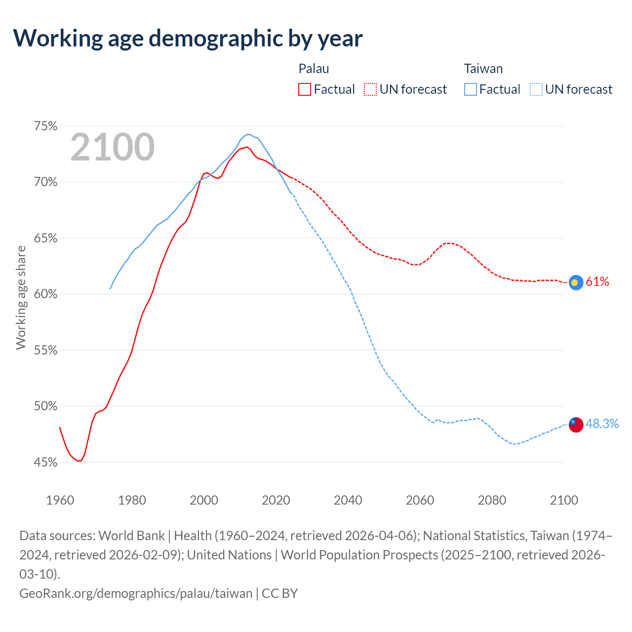 - Palau has 12.4K working age adults (aged 15-64) vs 16.1M in Taiwan.