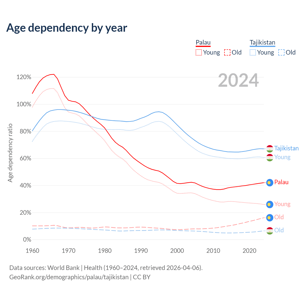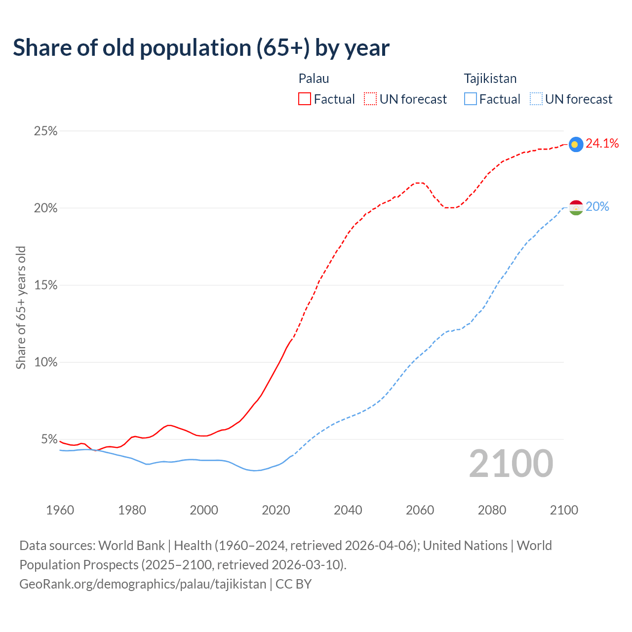 - The share of old-age demographic (65+) in Palau is 11.3% vs 3.85% in Tajikistan.