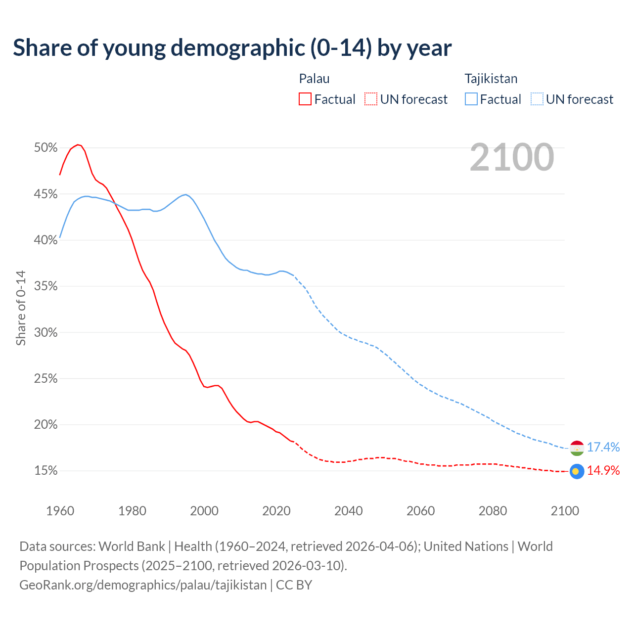 - The share of young demographic (0-15 years old) in Palau is 18.2% vs 36.3% in Tajikistan.