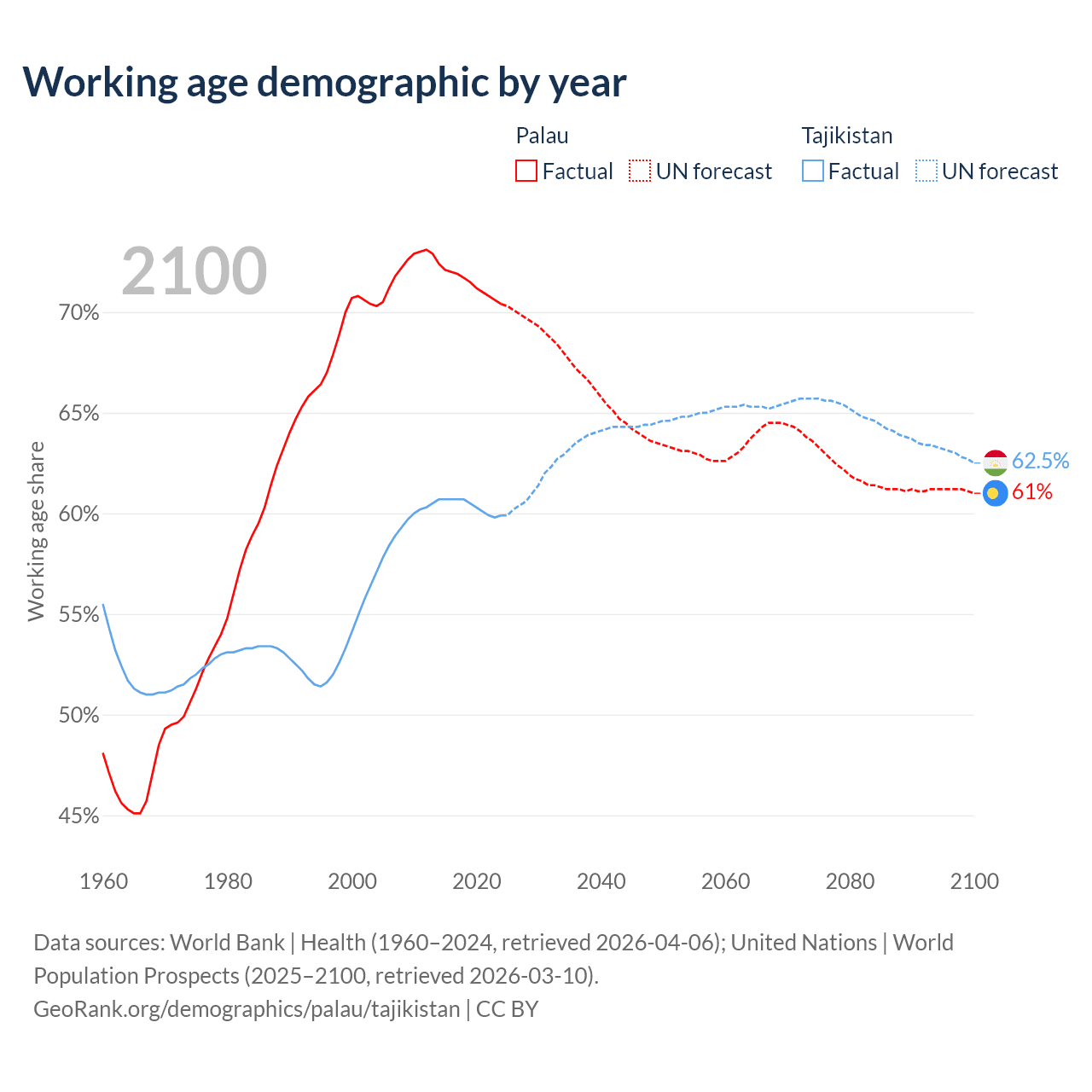 - Palau has 12.4K working age adults (aged 15-64) vs 6.61M in Tajikistan.