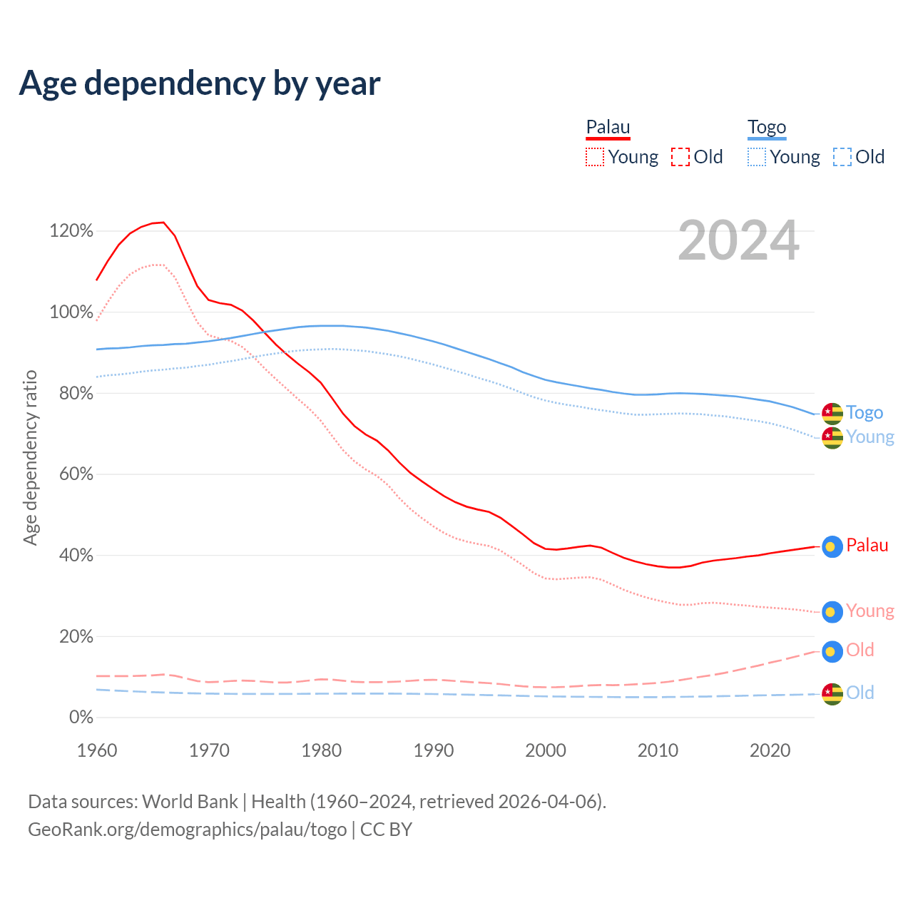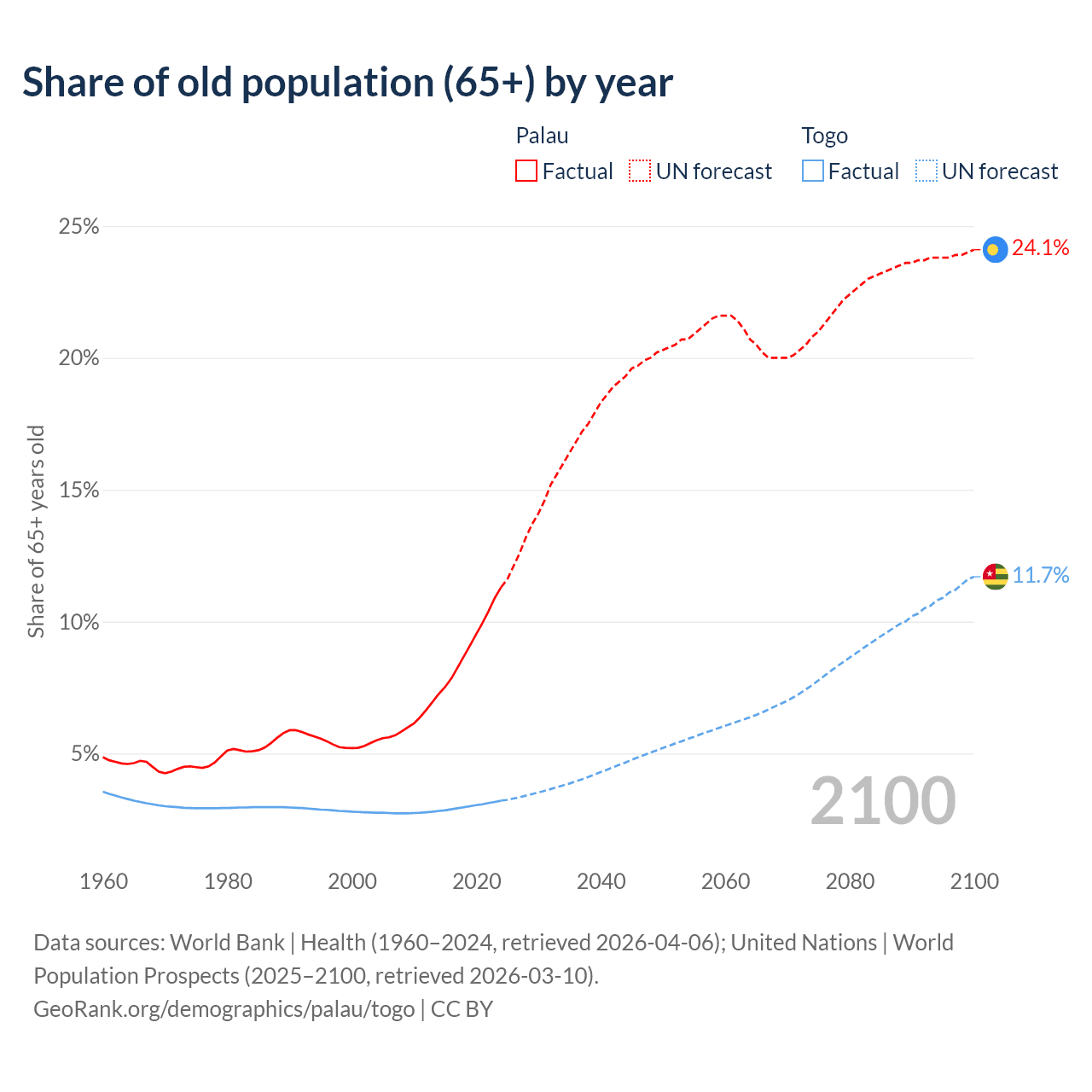 - The share of old-age demographic (65+) in Palau is 11.3% vs 3.21% in Togo.
