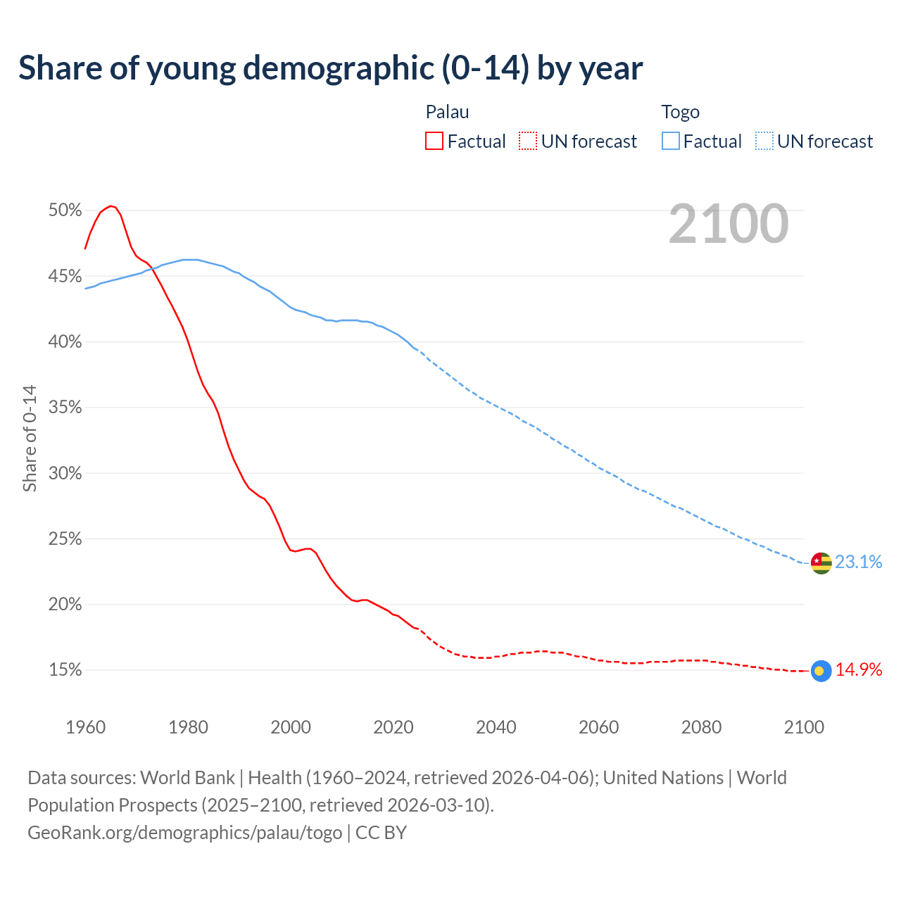 - The share of young demographic (0-15 years old) in Palau is 18.2% vs 39.5% in Togo.