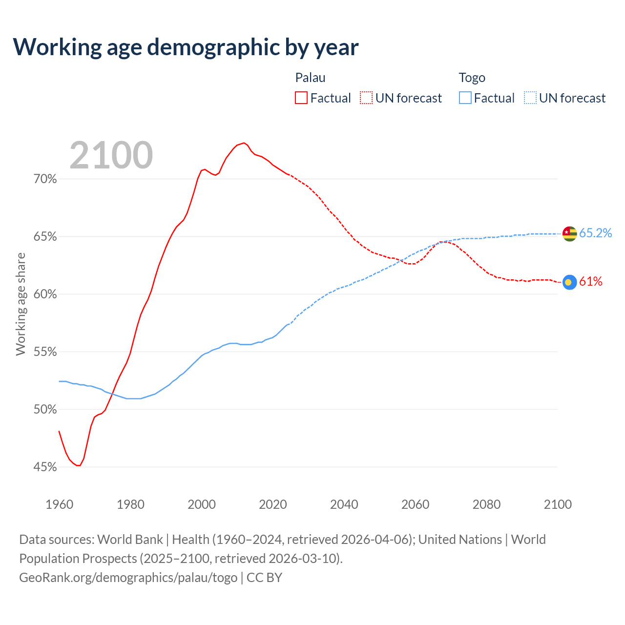 - Palau has 12.4K working age adults (aged 15-64) vs 5.72M in Togo.
