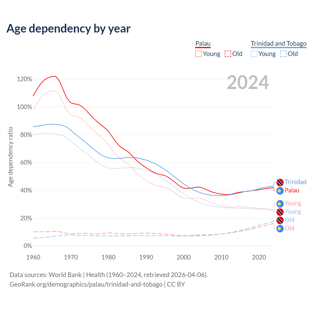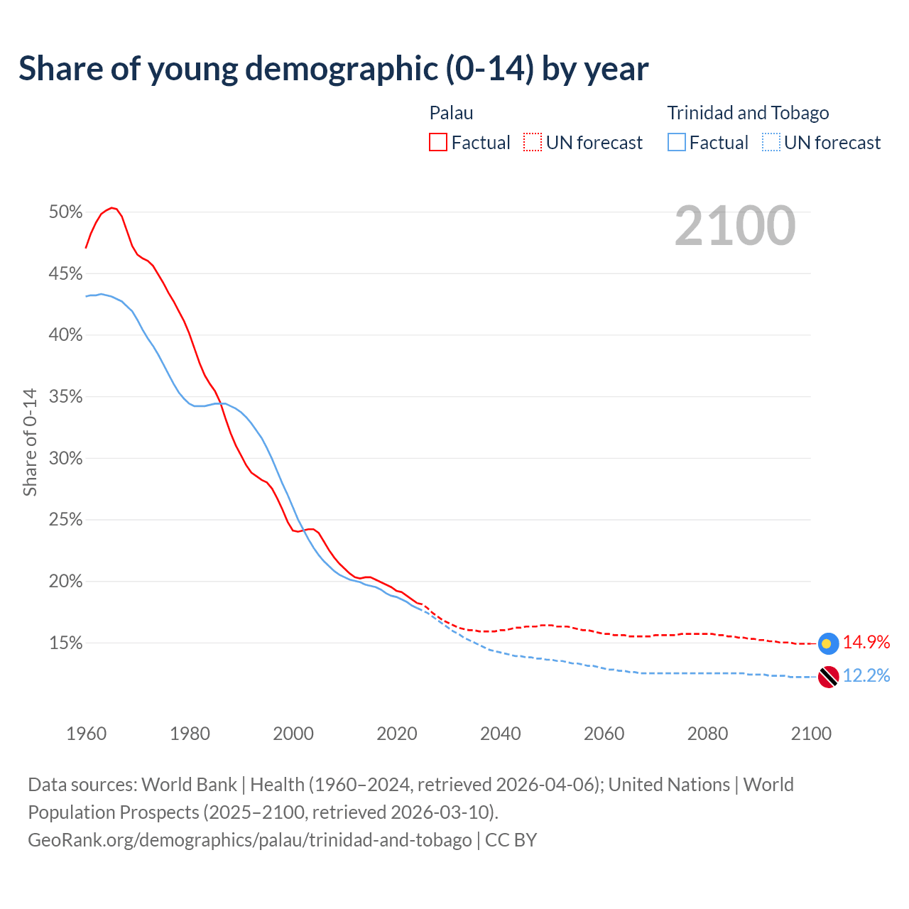 - The share of young demographic (0-15 years old) in Palau is 18.2% vs 17.8% in Trinidad and Tobago.
