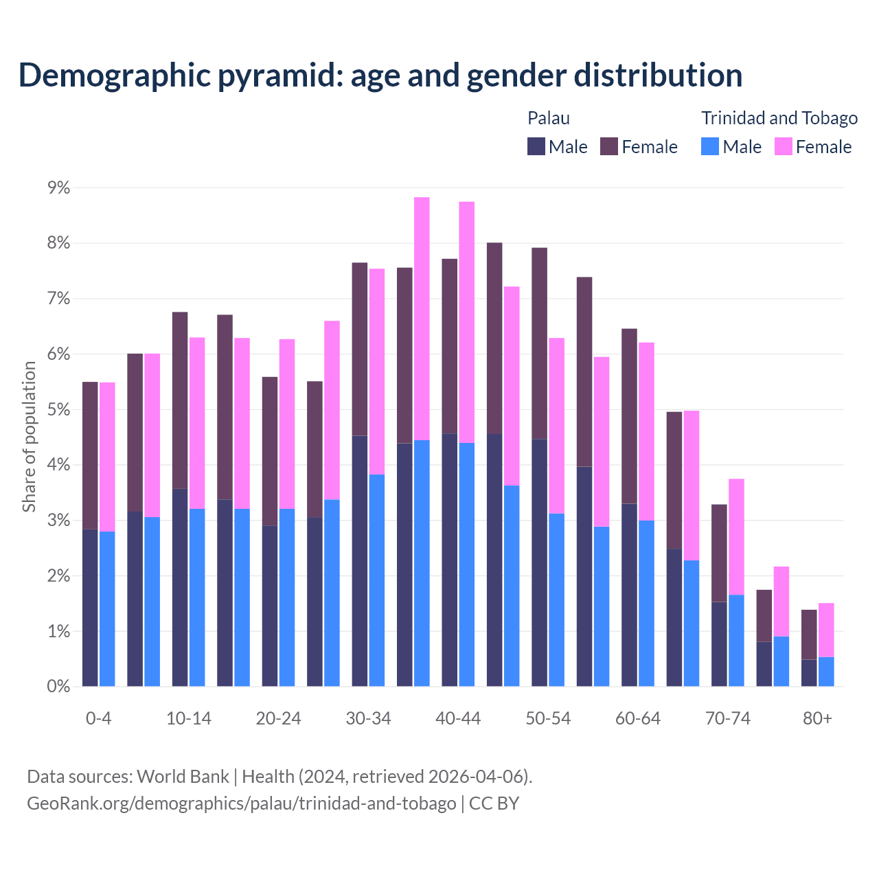 - Palau is ranked 53/196 by median age (oldest to youngest) vs 58/196 for Trinidad and Tobago.