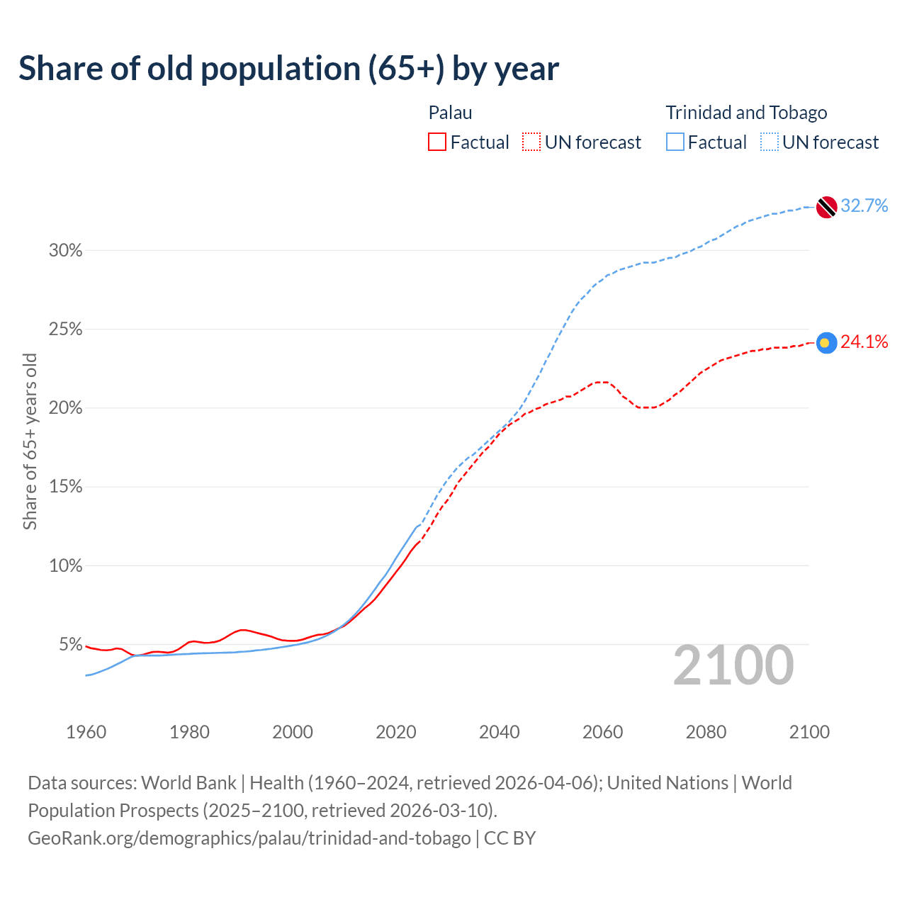 - The share of old-age demographic (65+) in Palau is 11.3% vs 12.4% in Trinidad and Tobago.