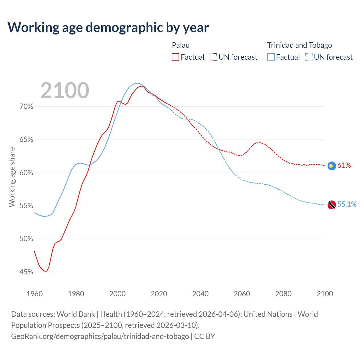 - Palau has 12.4K working age adults (aged 15-64) vs 960K in Trinidad and Tobago.