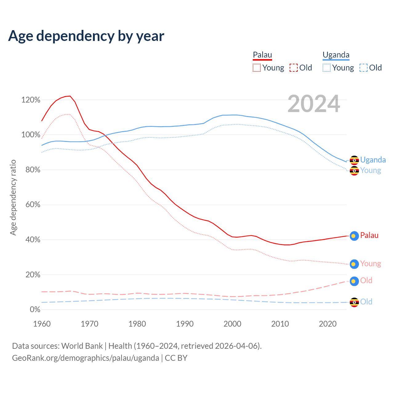 - The share of young demographic (0-15 years old) in Palau is 18.2% vs 43.5% in Uganda.