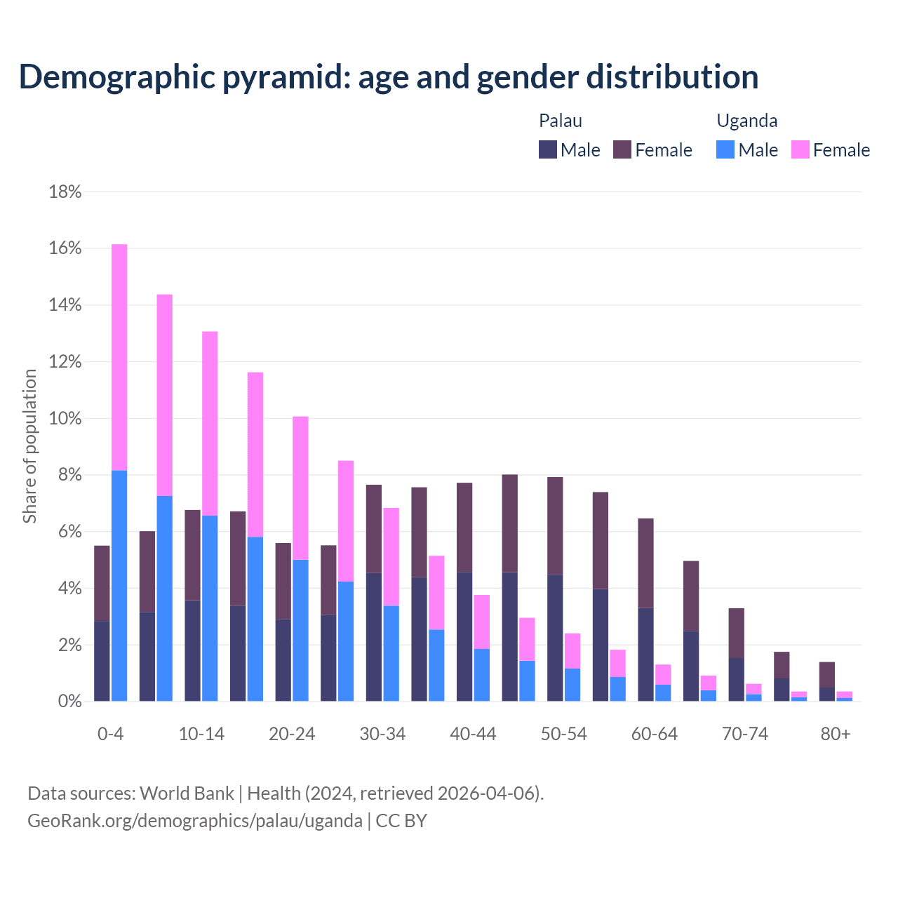 - Palau is ranked 53/196 by median age (oldest to youngest) vs 187/196 for Uganda.