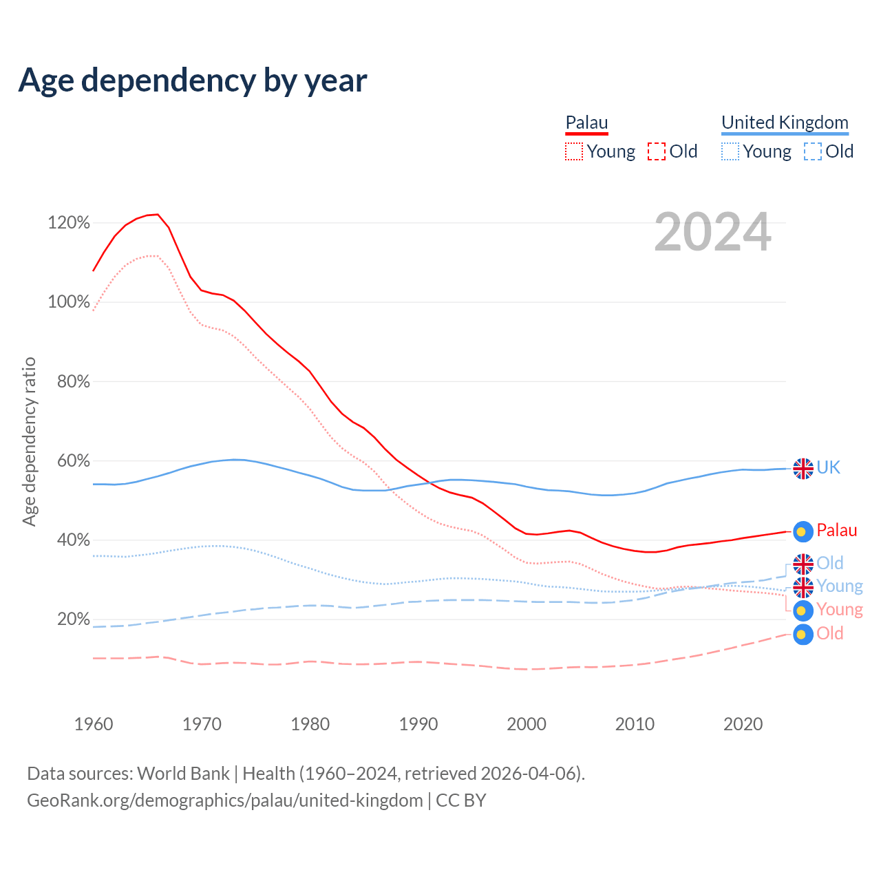 - The share of young demographic (0-15 years old) in Palau is 18.2% vs 17.2% in the United Kingdom.