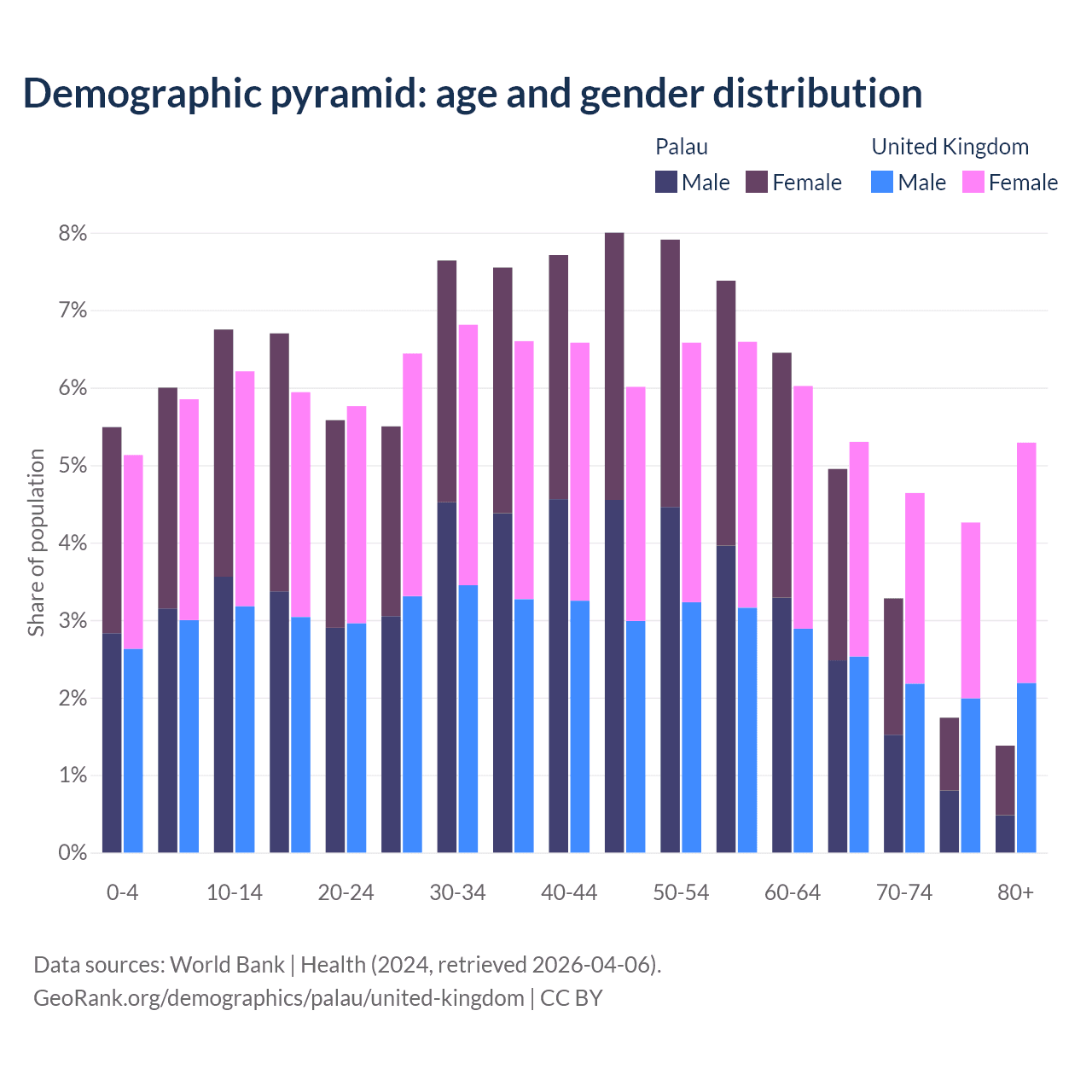 - Palau is ranked 53/196 by median age (oldest to youngest) vs 41/196 for the United Kingdom.