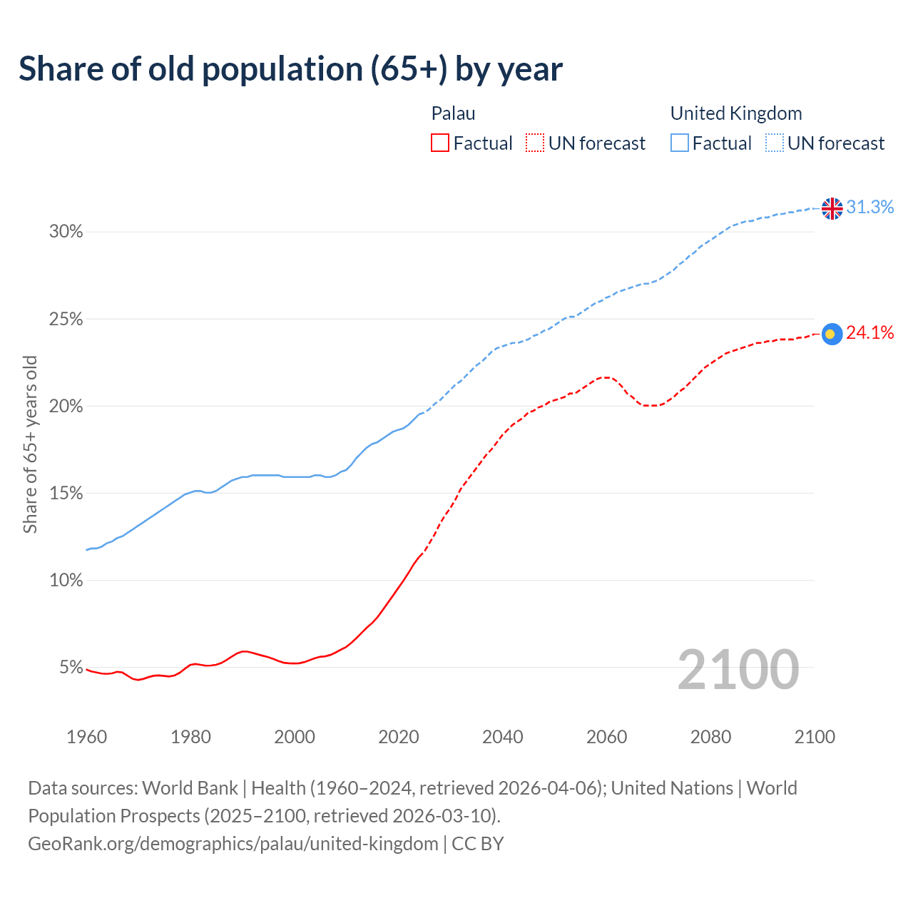 - The share of old-age demographic (65+) in Palau is 11.3% vs 19.5% in the United Kingdom.