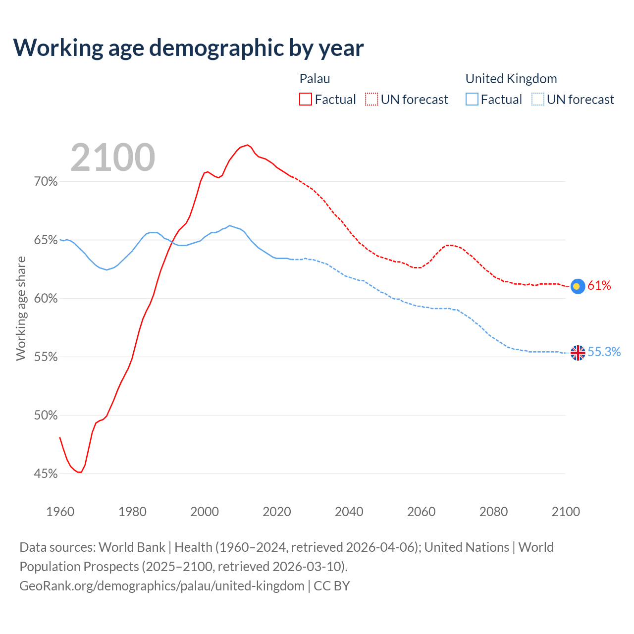 - Palau has 12.4K working age adults (aged 15-64) vs 44.4M in the United Kingdom.