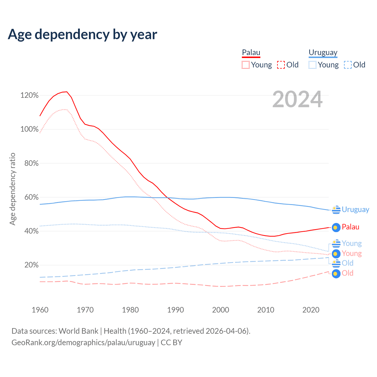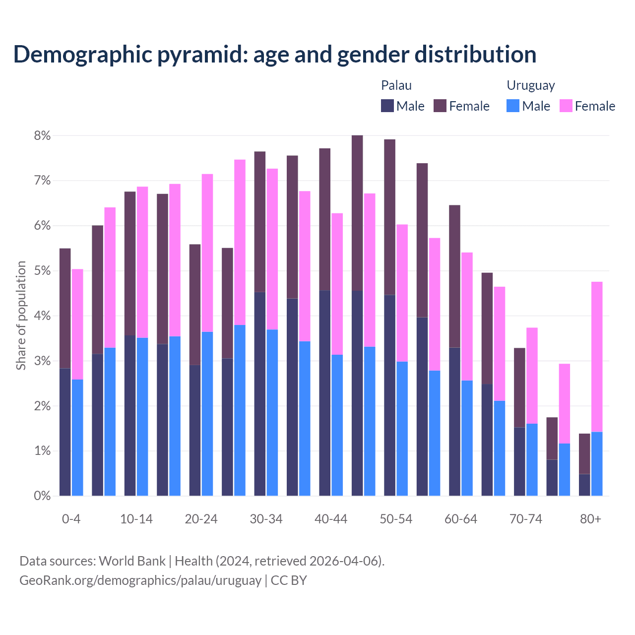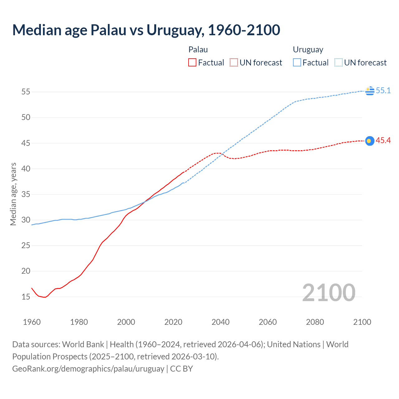 - Palau is ranked 53/196 by median age (oldest to youngest) vs 63/196 for Uruguay.