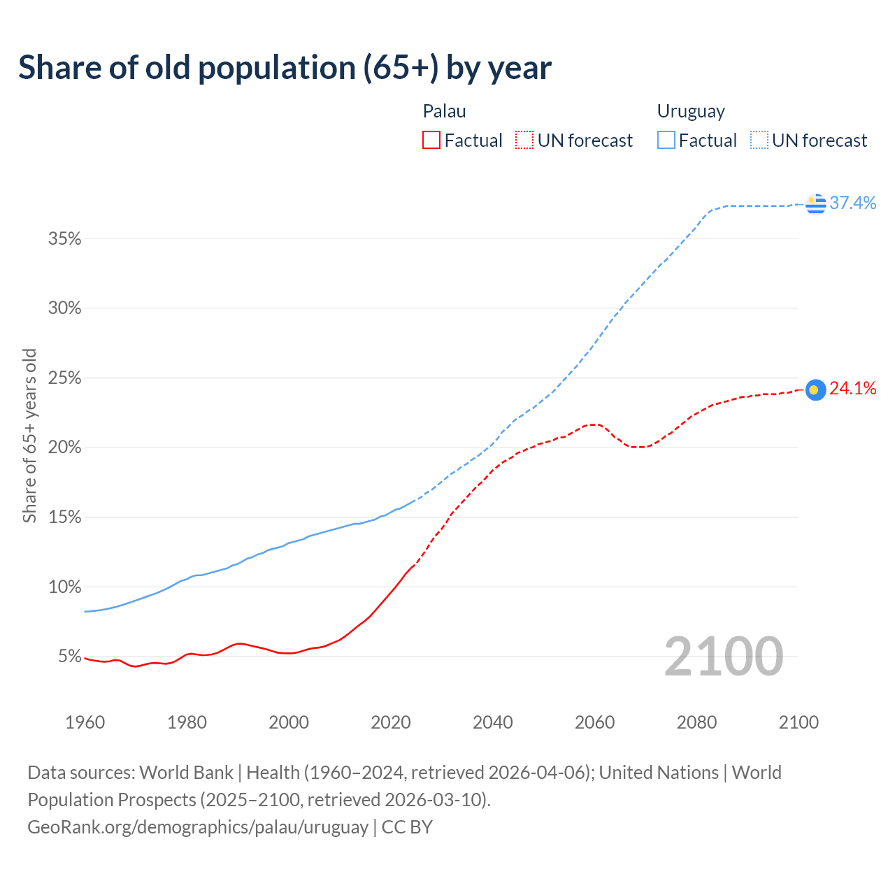 The share of older people aged 65 and over is 11.3% in Palau and 16% in Uruguay. Life expectancy in Palau compared to Uruguay .