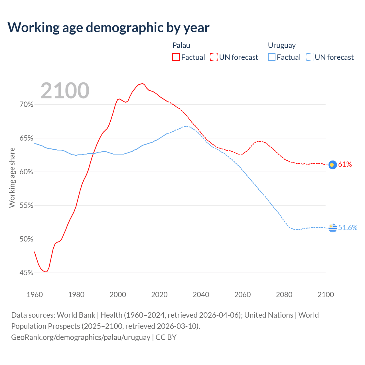- The share of young demographic (0-15 years old) in Palau is 18.2% vs 18.3% in Uruguay.