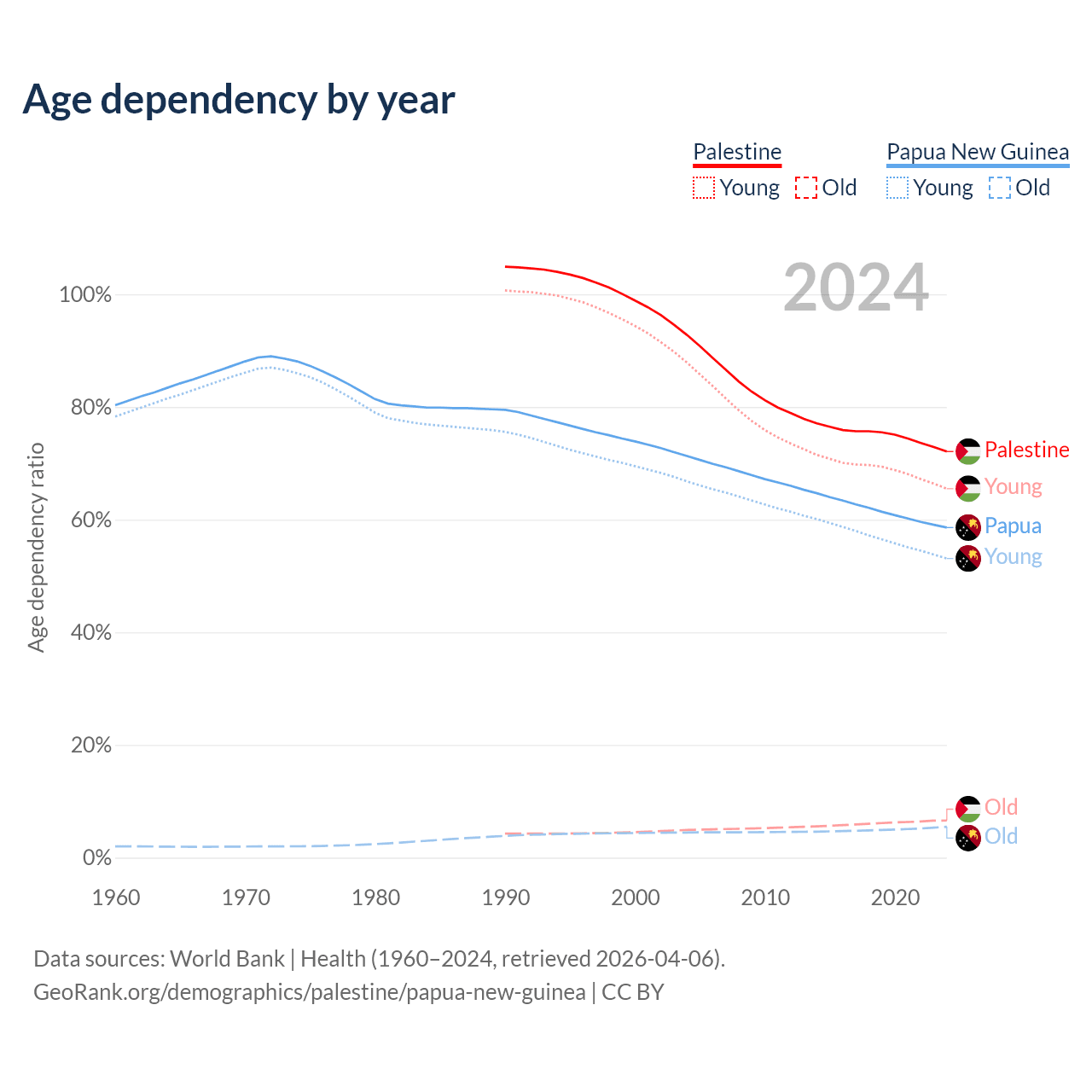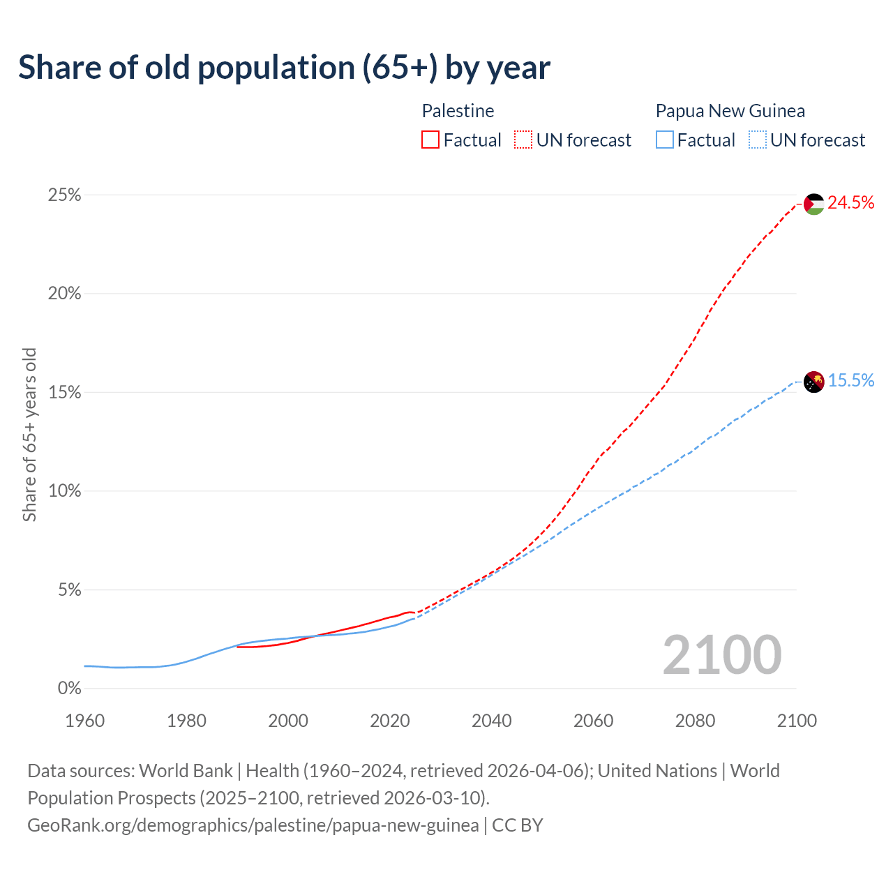 - The share of old-age demographic (65+) in Palestine is 3.84% vs 3.46% in Papua New Guinea.